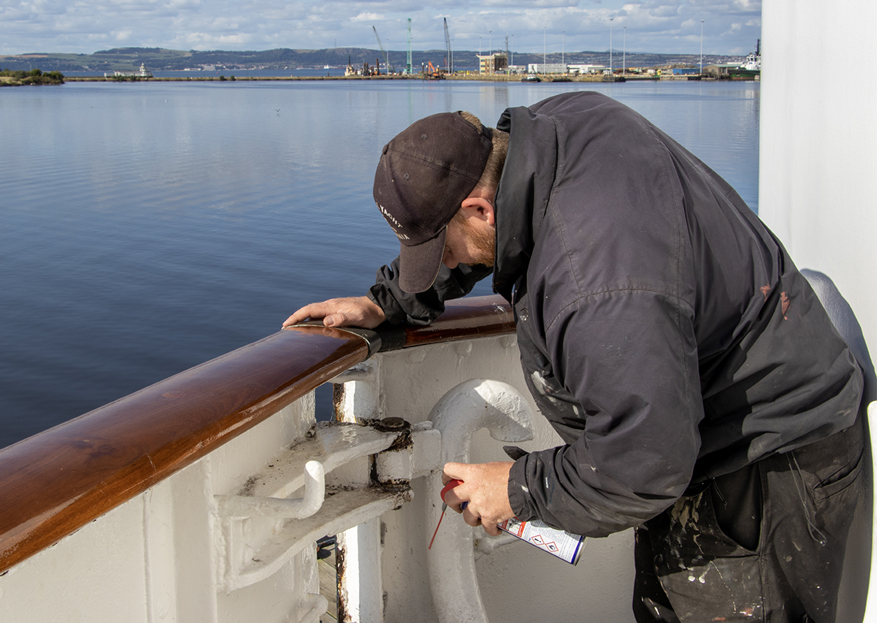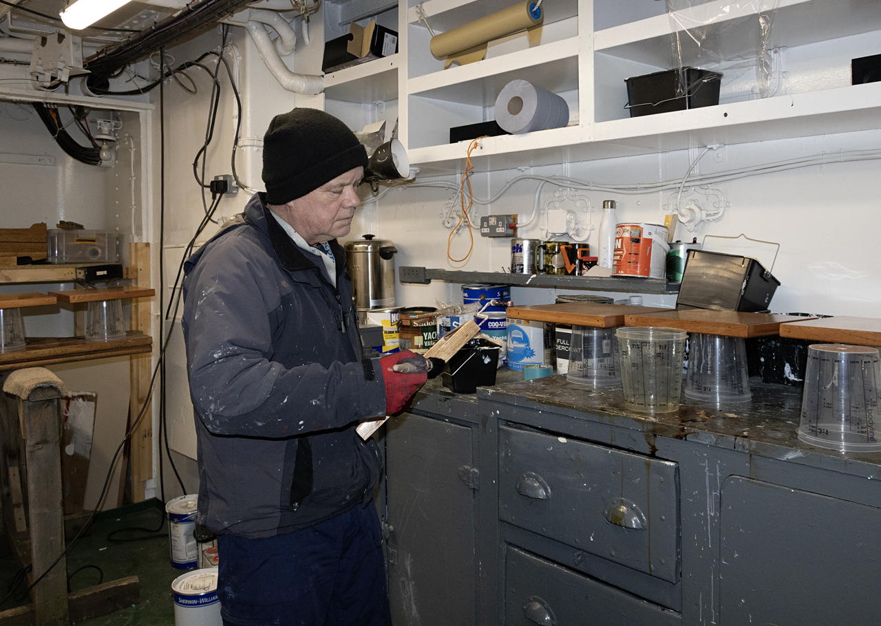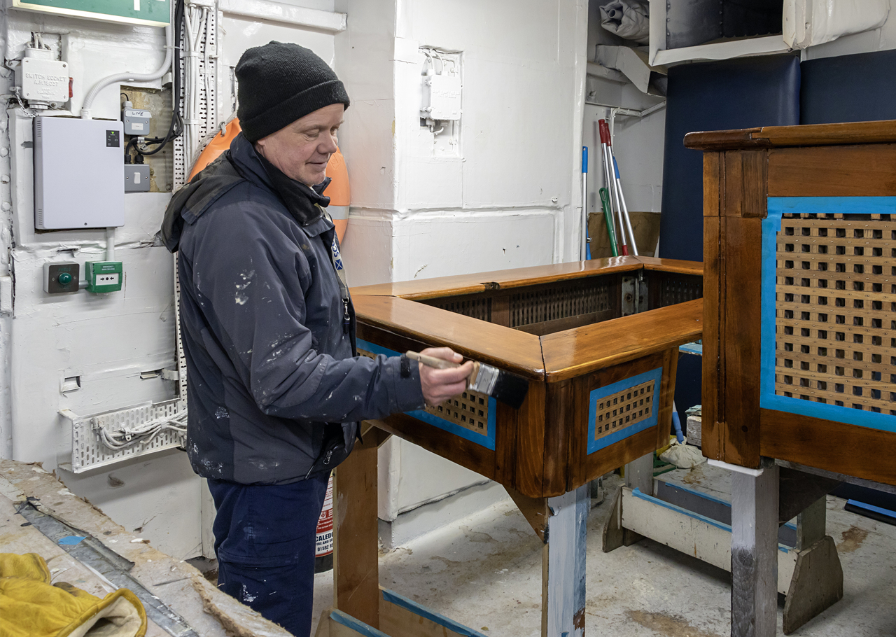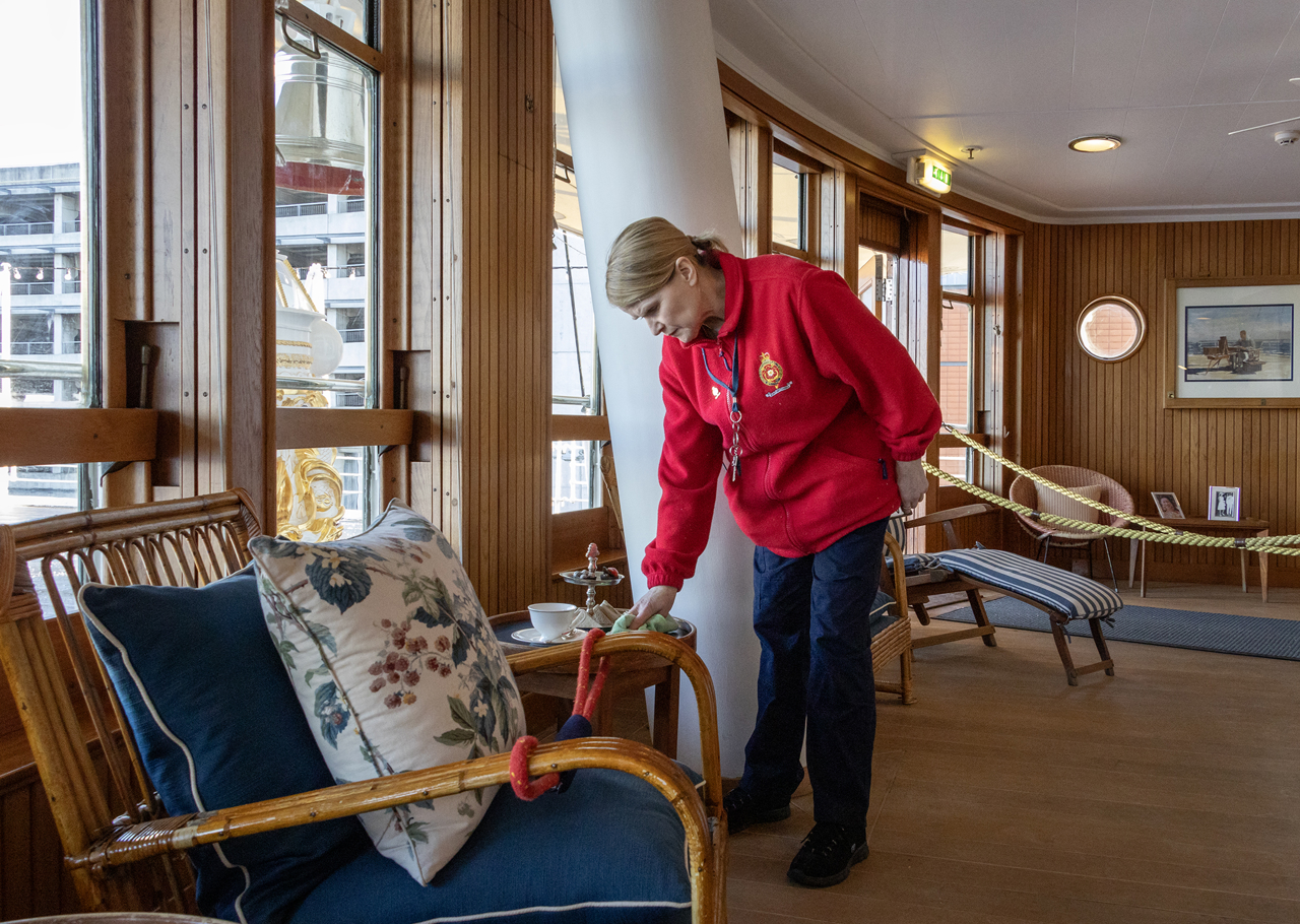 Lynne, Housekeeper, ensuring that Queen Elizabeth II's favourite room aboard is beautifully maintained.