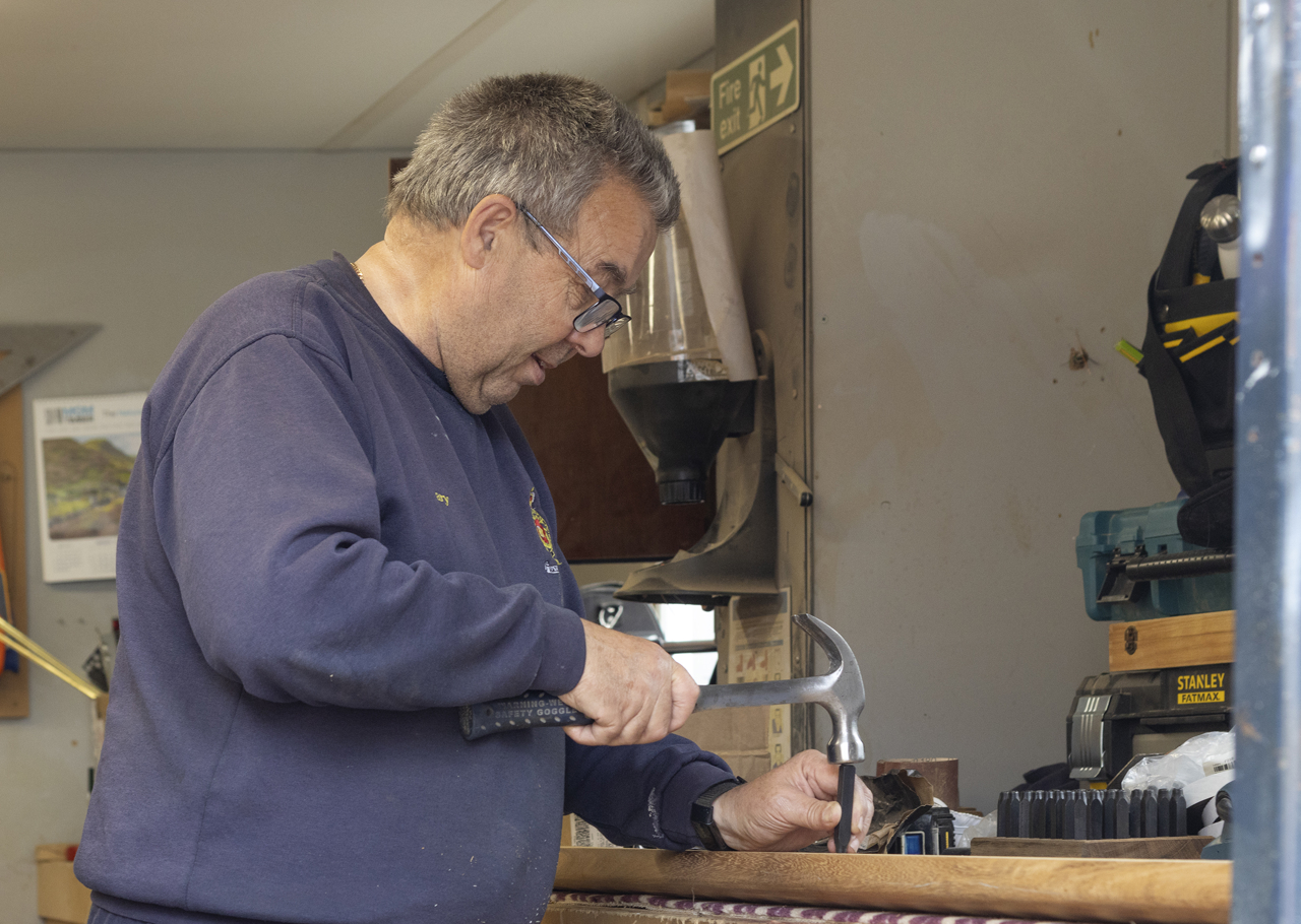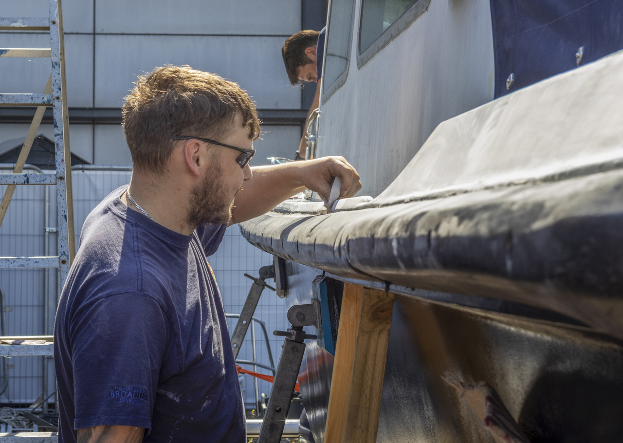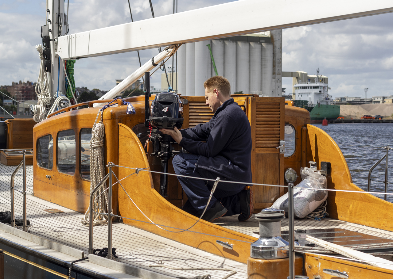 Alastair fitting the outboard motor for the dinghy aboard Royal Racing Yacht Bloodhound, which is part of the Trust's fleet.