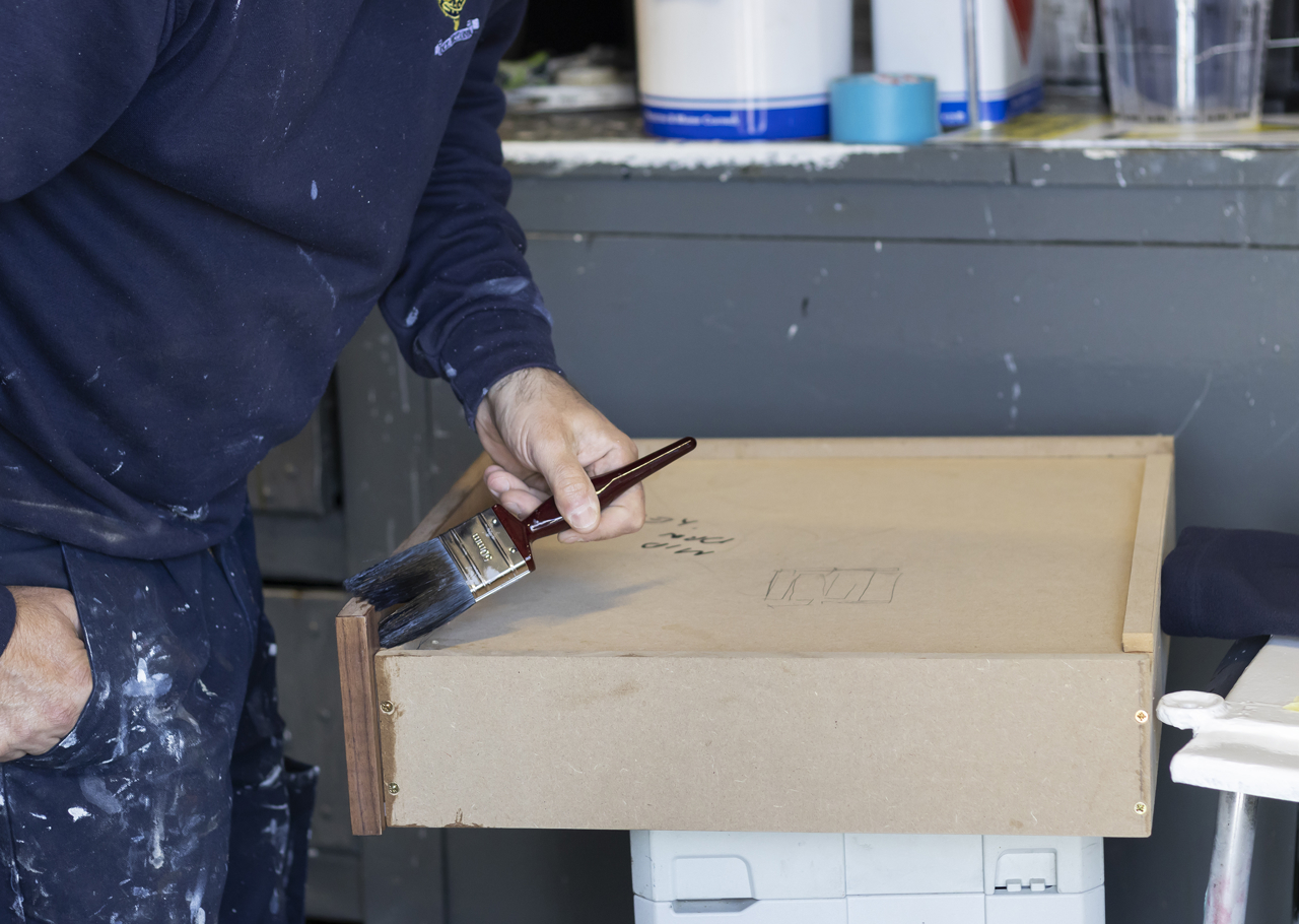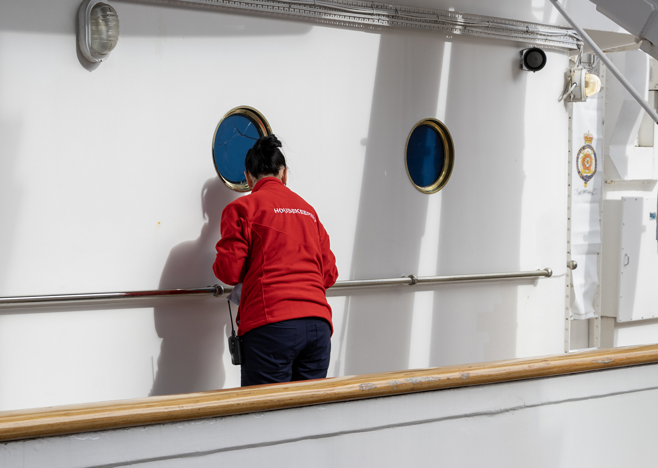 Housekeeper, Angelina, polishing on Britannia’s port side, keeping Britannia in shipshape condition.