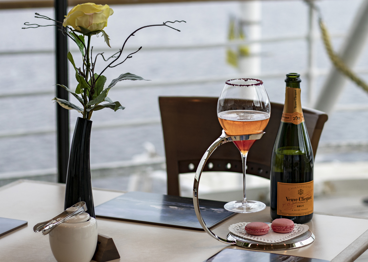 The Royal Deck Tea Room's special for Valentine's Day is a glass of Champagne with a rose petal and rosehip infused sugar syrup, served alongside delicate rose flavoured macarons made by our onboard pastry chefs.