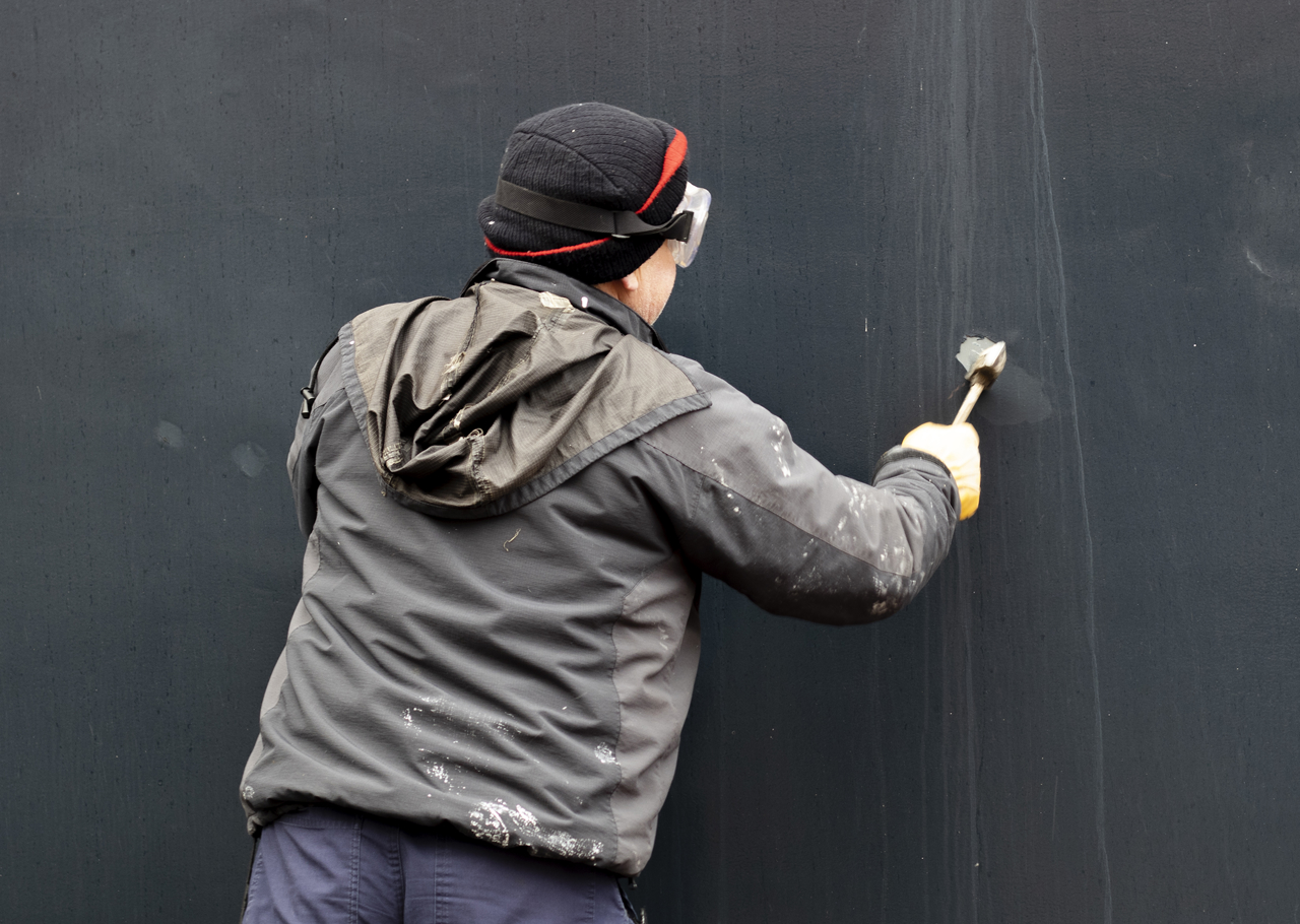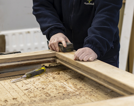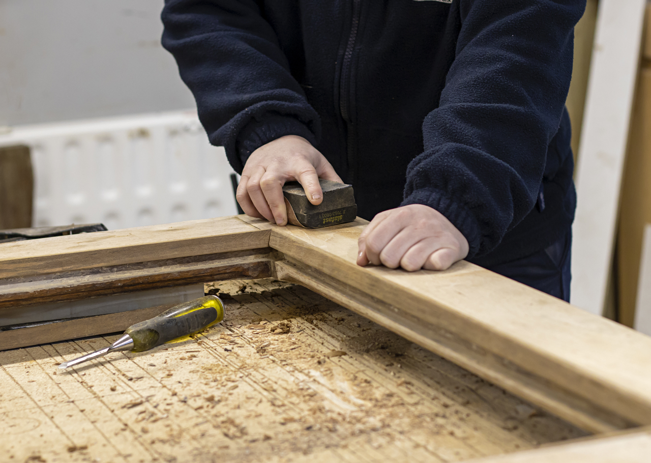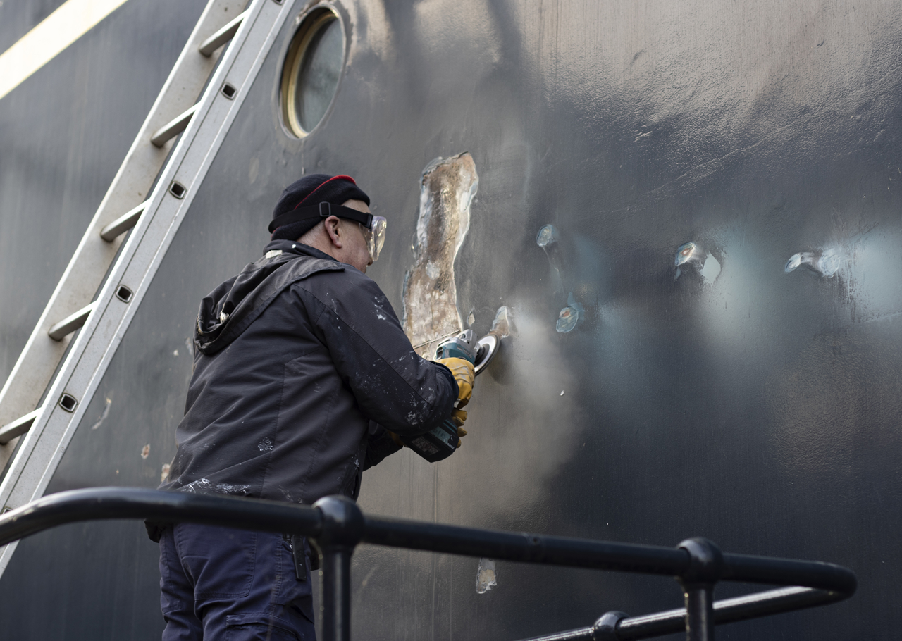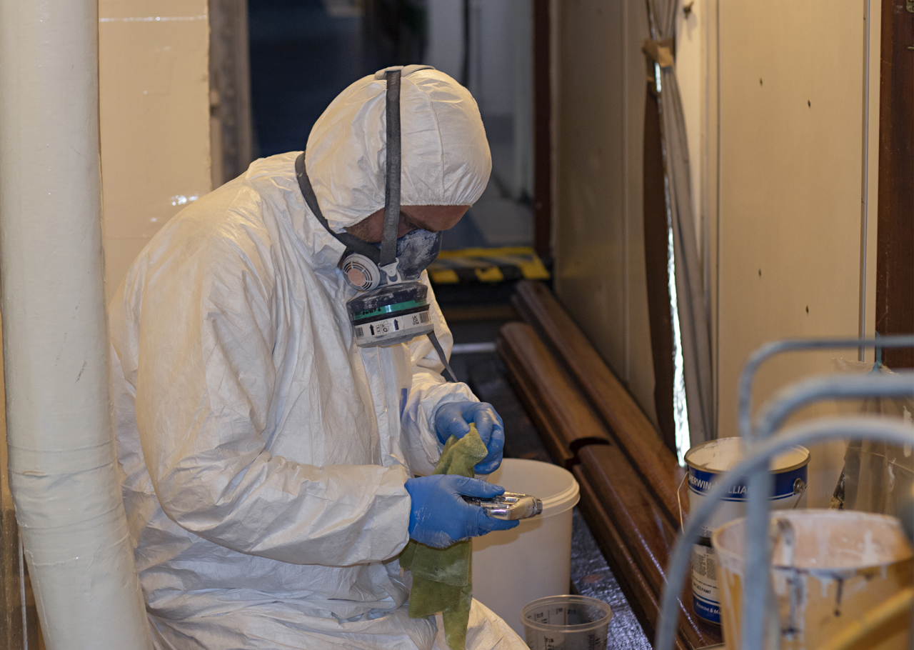 Anhelina, Housekeeper, polishing an office door porthole during a deep clean this week of the office suite.