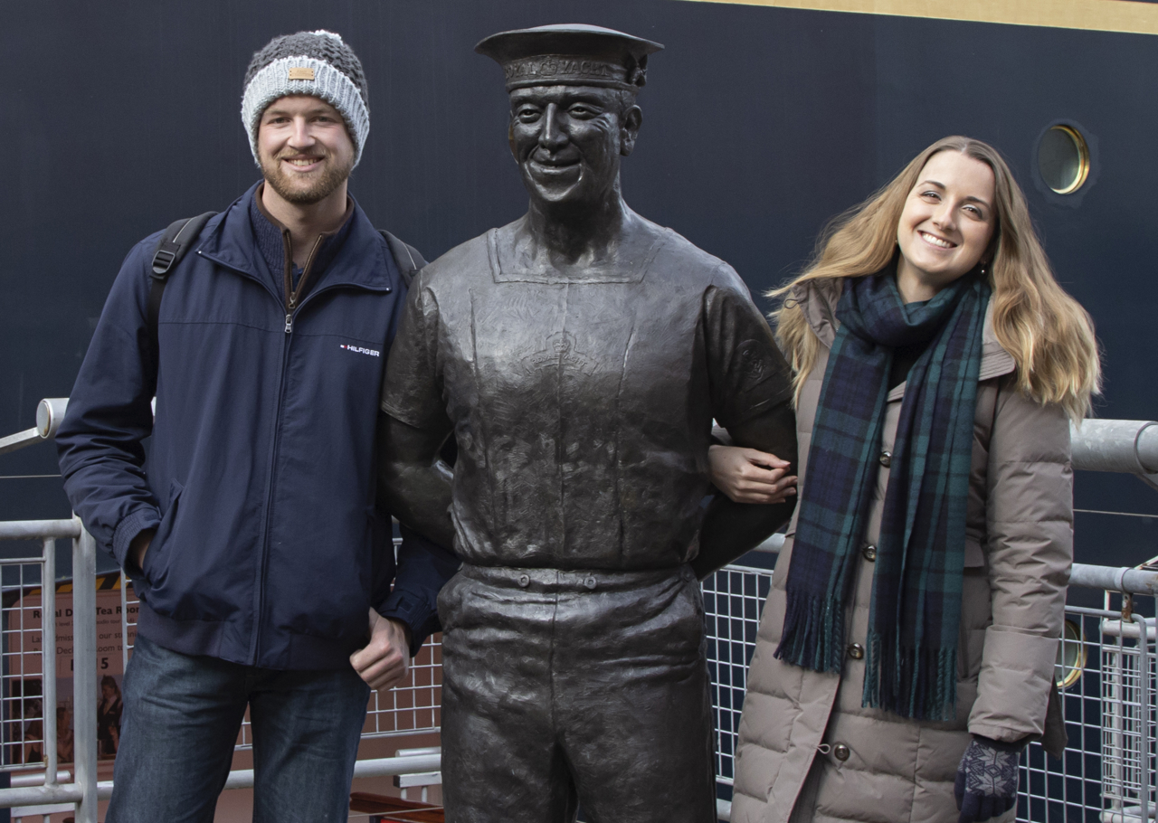 Visitors stand next to a statue of the longest serving crew member on board Britannia, Ellis 'Norrie' Norrell MVO RVM.