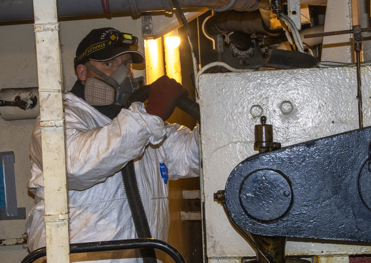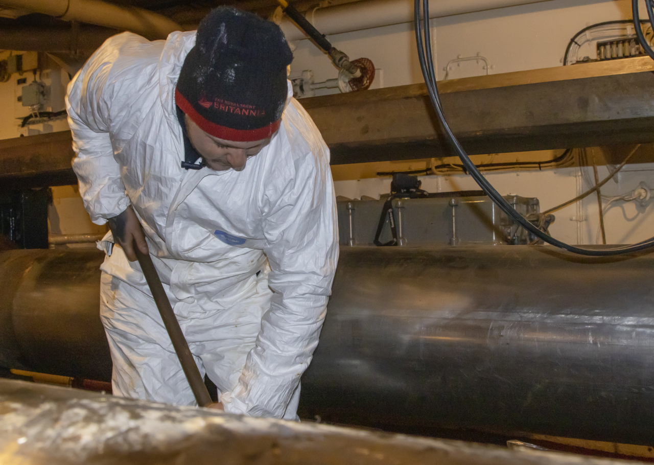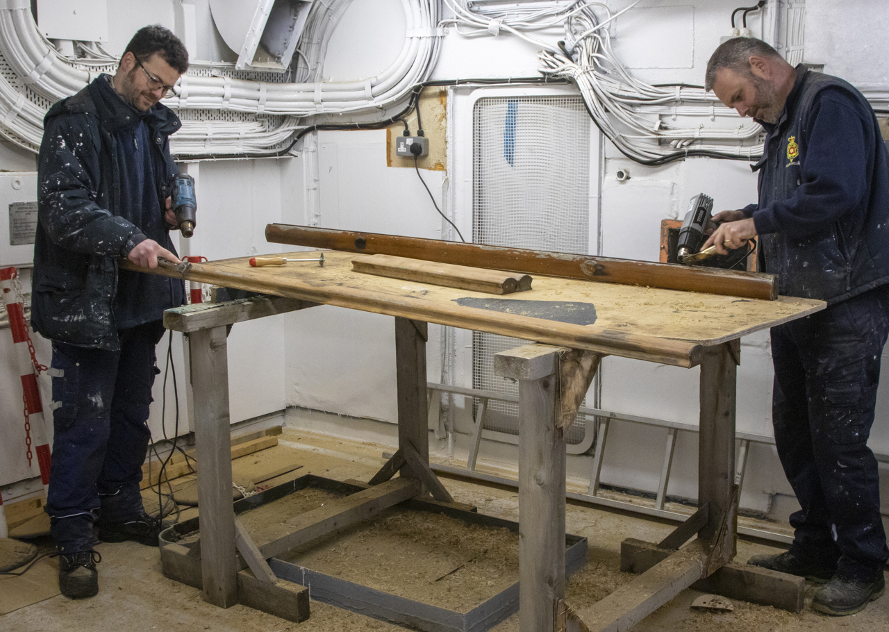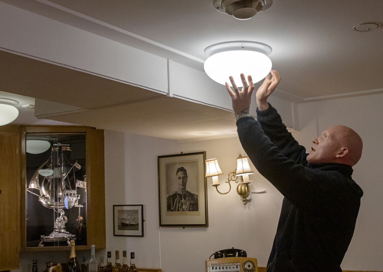 Donald, Facilities Officer, removing a lightshade fitting for cleaning in the Wardroom Anteroom, where the Officers would relax and unwind after hours.