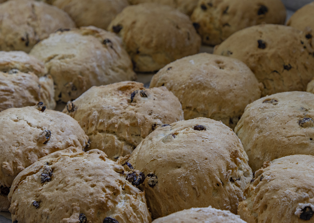 A freshly baked batch of fruit scones awaiting hungry visitors to the Tea Room. With a great assortment of sweet baked treats on our menu, made by our talented Pastry chefs onboard, what will you choose?