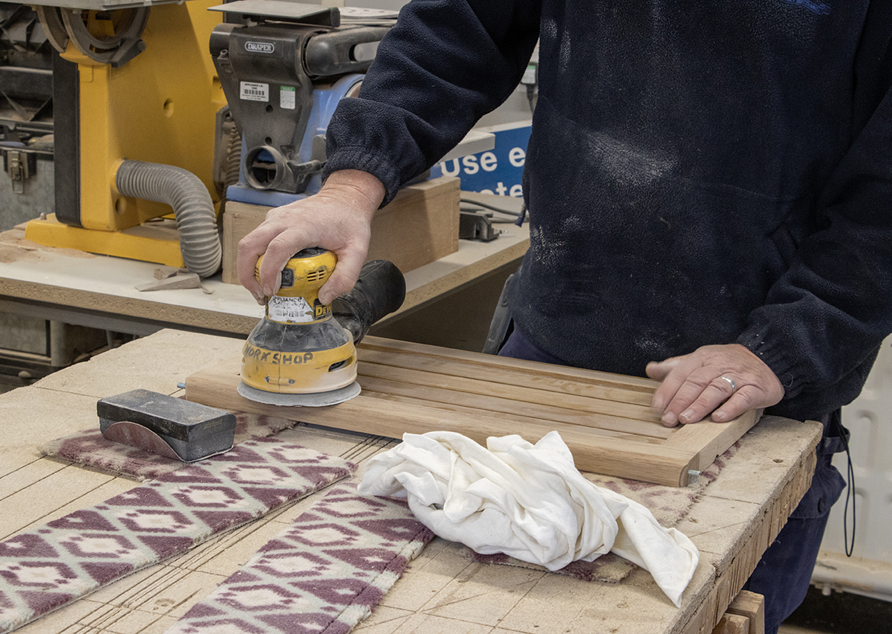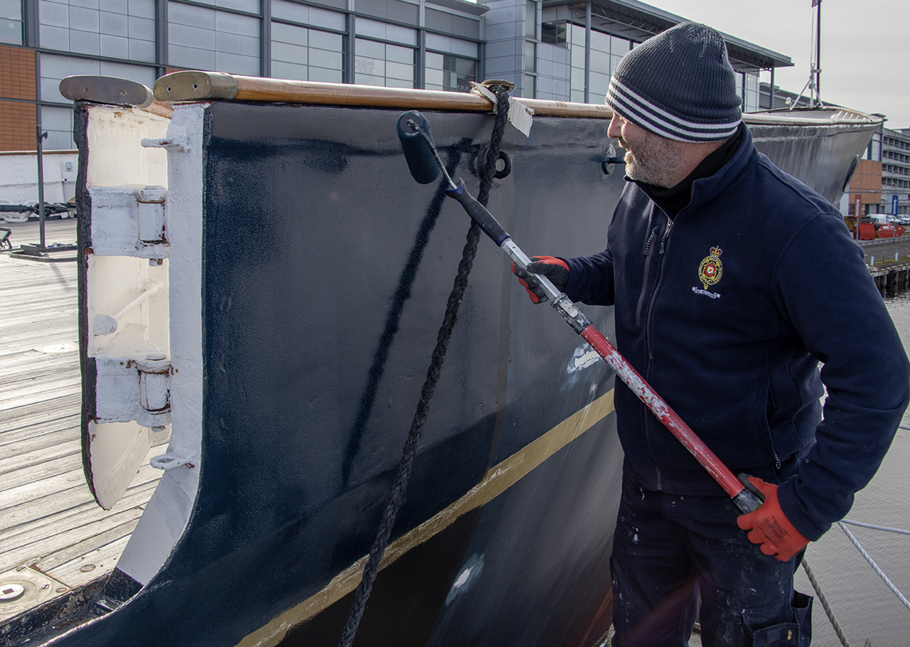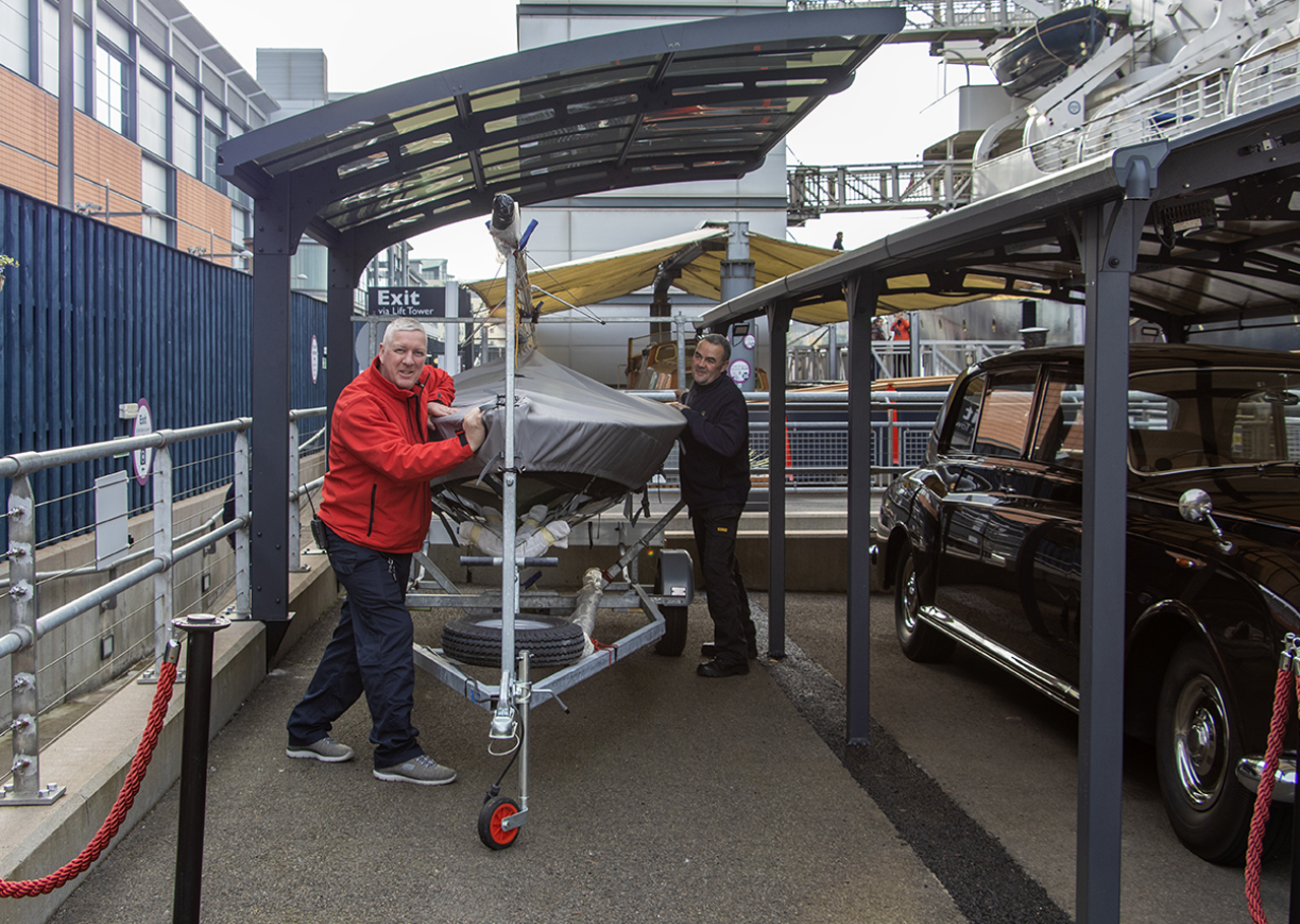 Facilities Officers Kirk and Paul, give shelter to the Flying Fifteen Sailing Boat Coweslip under the new canopy on the quayside.
