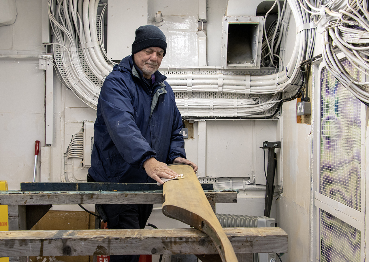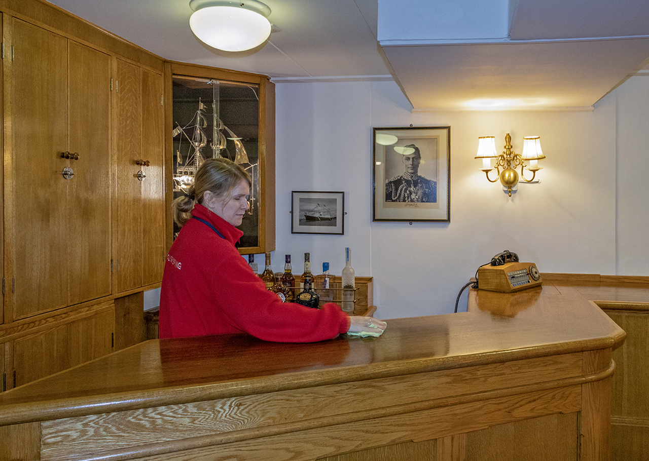 Lynne, Housekeeper, adding a sparkling shine to the bar in Britannia's Wardroom Anteroom, where the Officers could relax and unwind after hours.