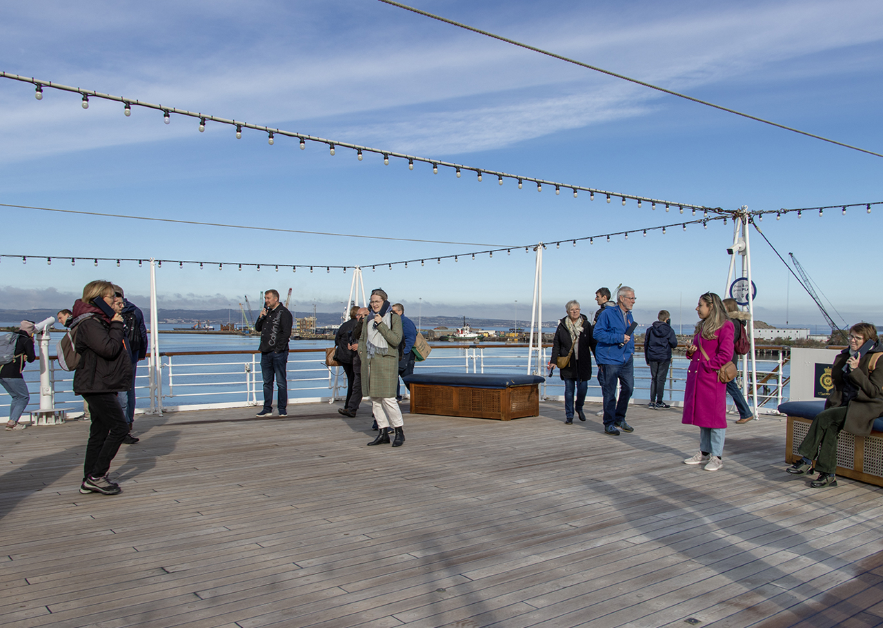 A group of visitors are captivated by the stories in the complimentary audio guided tour on the Verandah Deck.