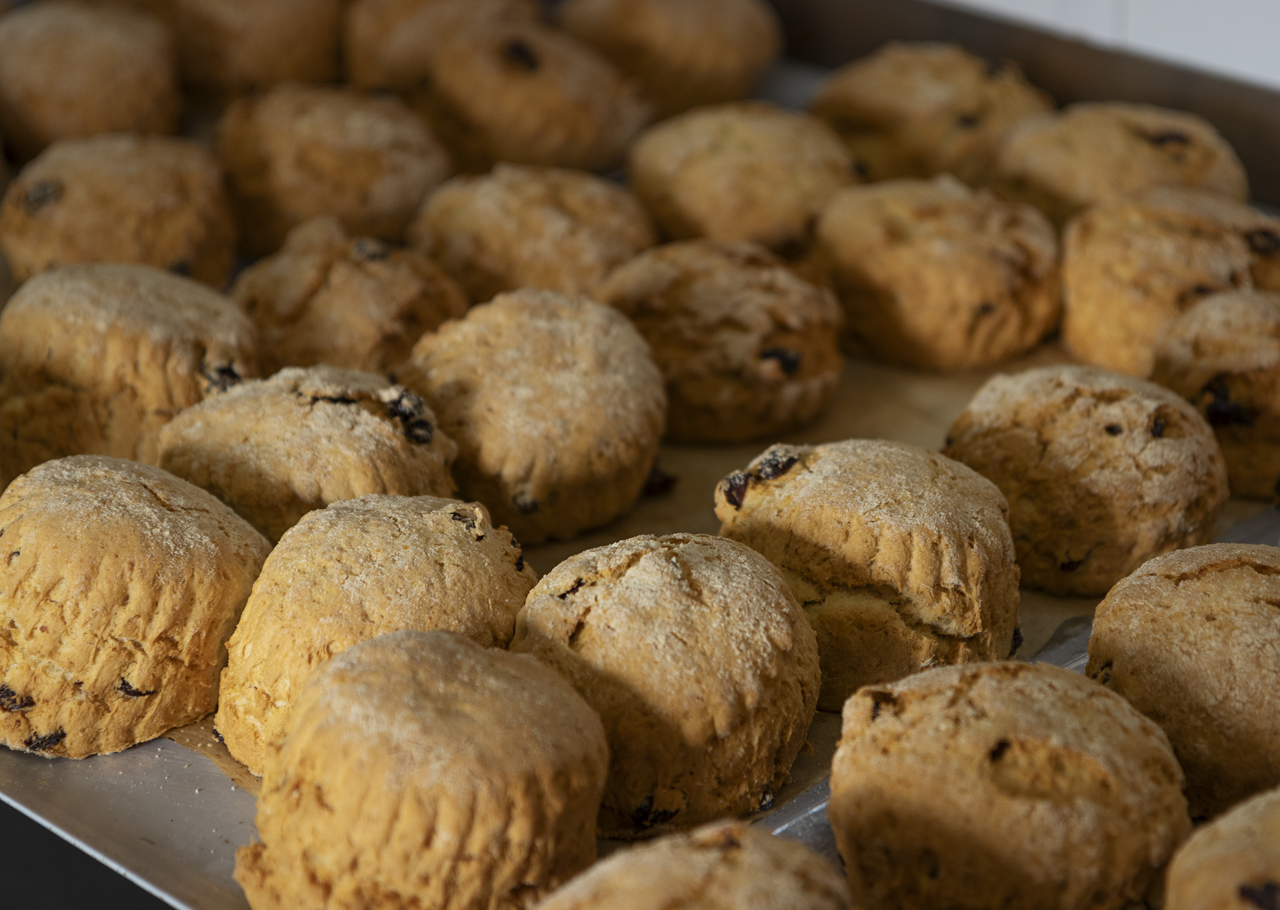 Delicious fruit scones, baked in our onboard Galley, ready to be served with strawberry preserve and clotted cream.