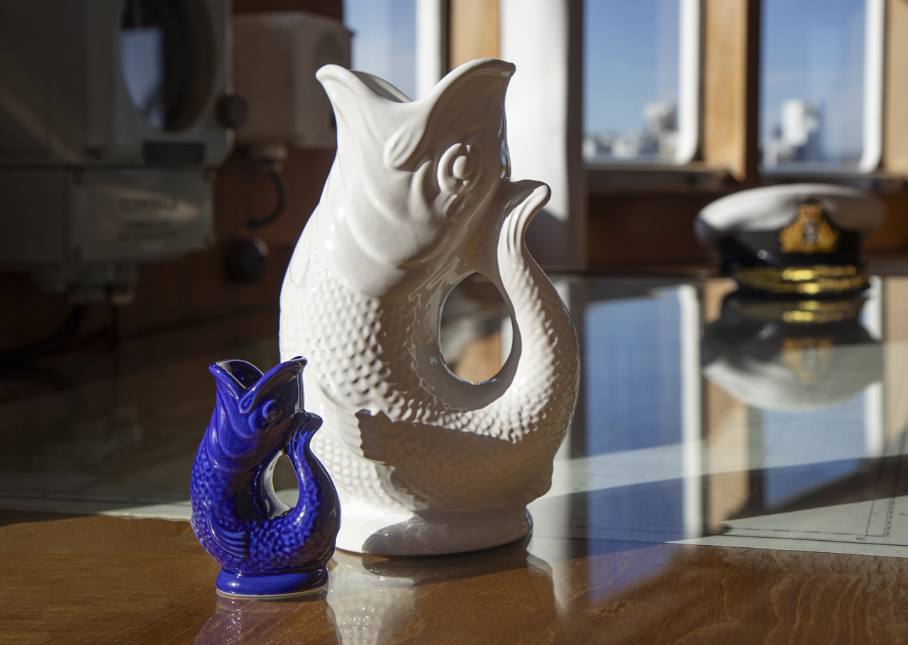 The latest addition to the Gift Shop, a selection of Gluggle jugs. In 1958, Queen Elizabeth II was presented with a special pair of Gluggle jugs on her visit to Britannia Royal Naval College, Dartmouth.