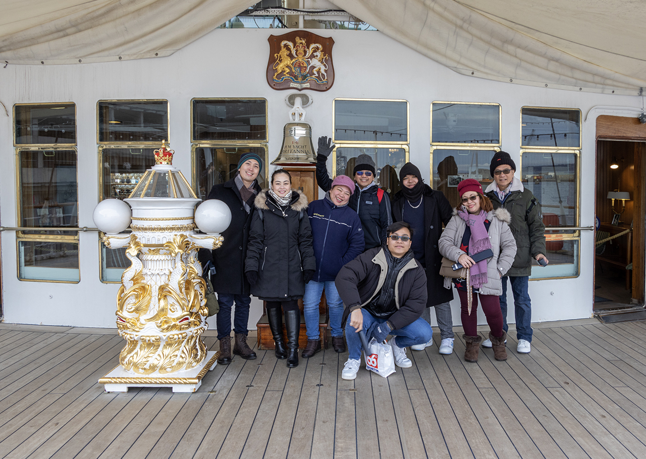 Fun aboard The Royal Yacht Britannia, with a visitor posing for a playful photo under Britannia's bell.
