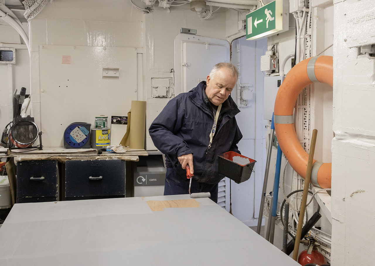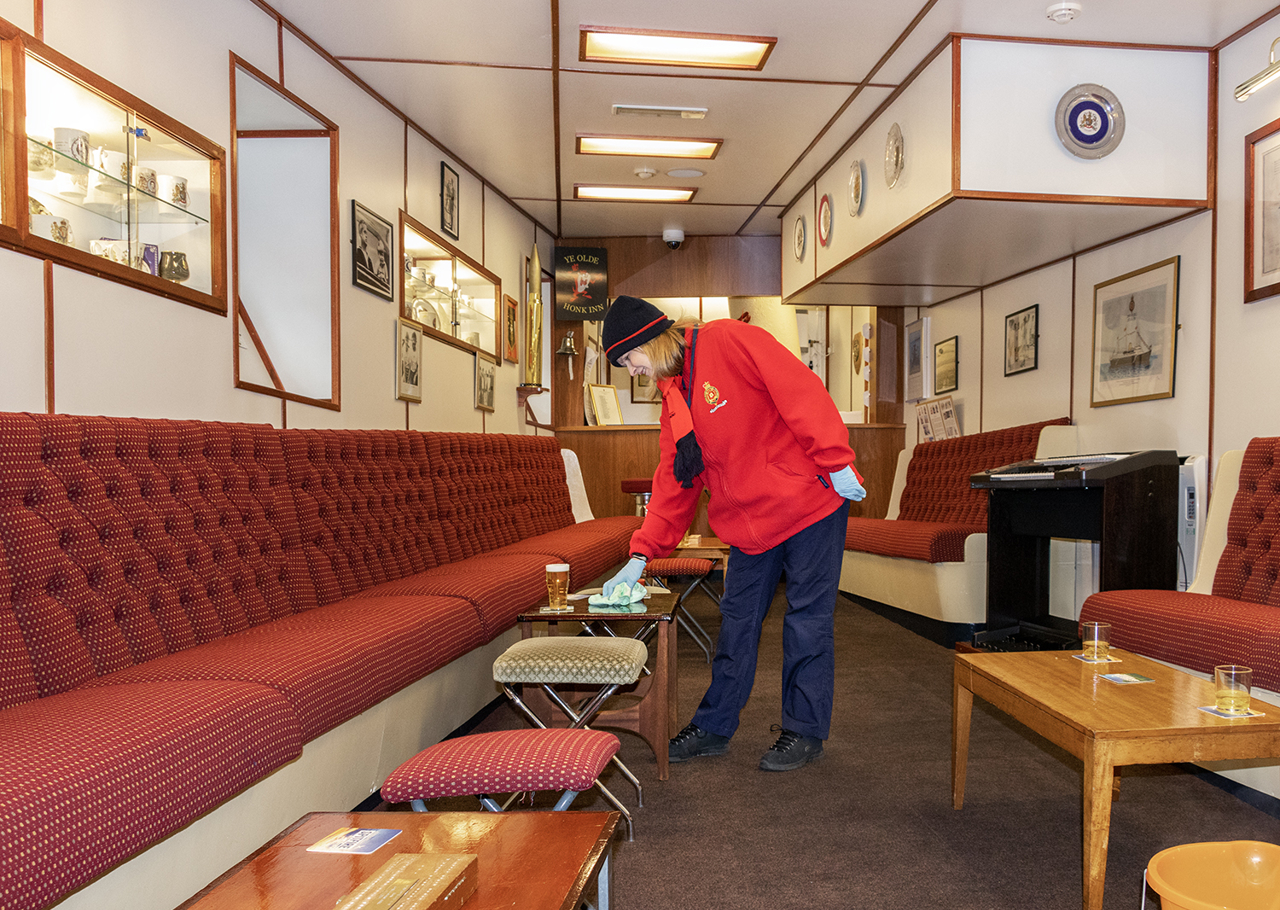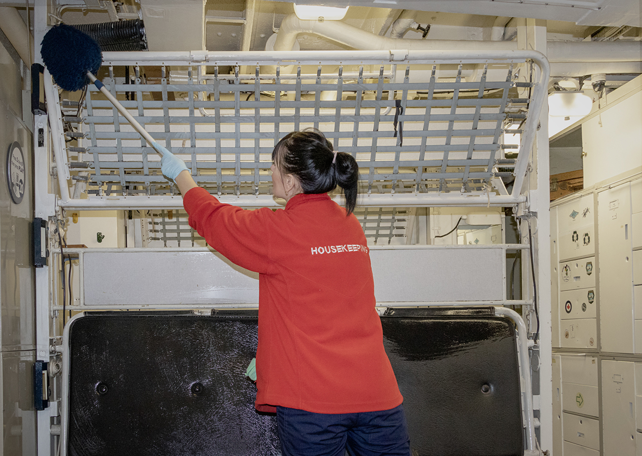 Housekeeper, Lynne, working to ensure the Unwinding Room is ship-shape. This was where all of the Junior Ratings from different departments would relax and unwind after working hours.