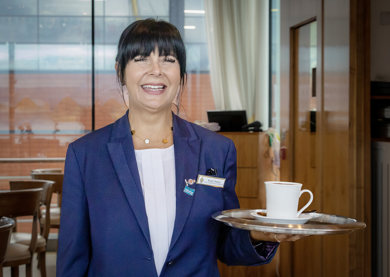 Wendy, Food and Beverage Supervisor, is a member of the friendly team in the Royal Deck Tearoom, ready to greet visitors for a delicious stop during their tour.
