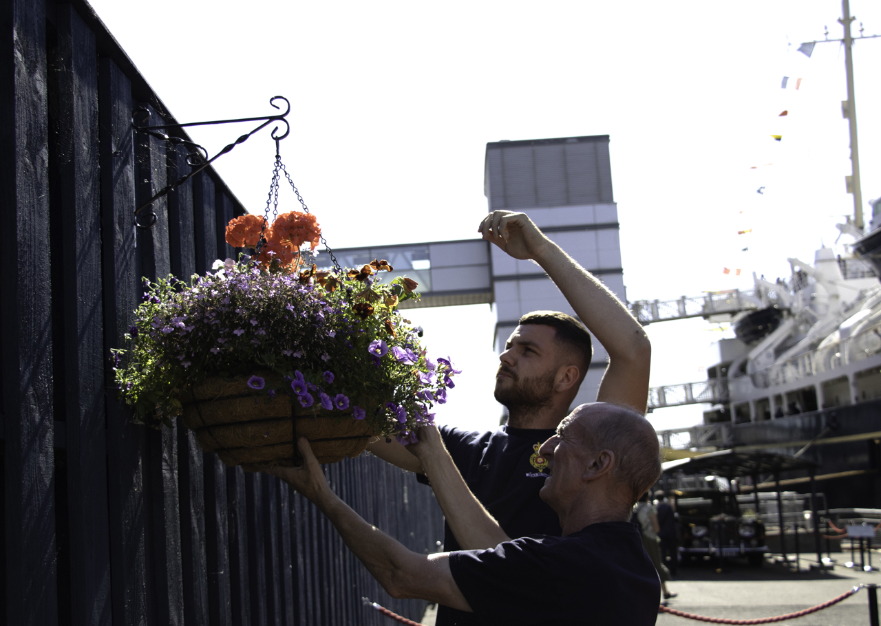 Facilities Officer, Steven, and Senior Facilities Officer, Ricky, putting our beautiful hanging baskets back on the quayside.