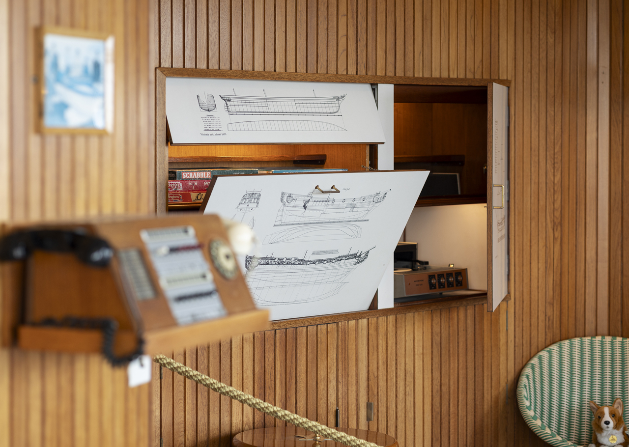 In the Sun Lounge, wall panels cleverly hide a drinks cabinet on one side, and a record player along with a games store on the other.