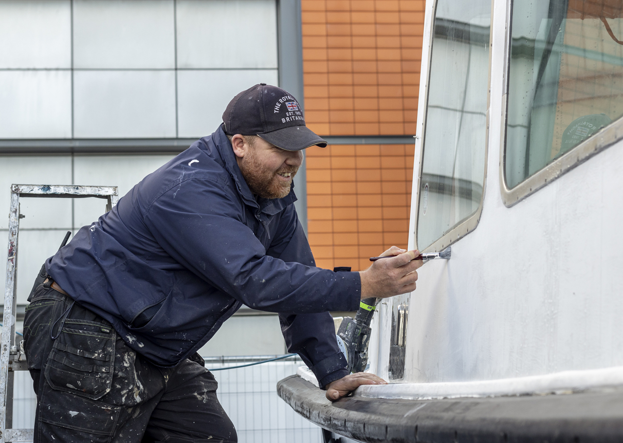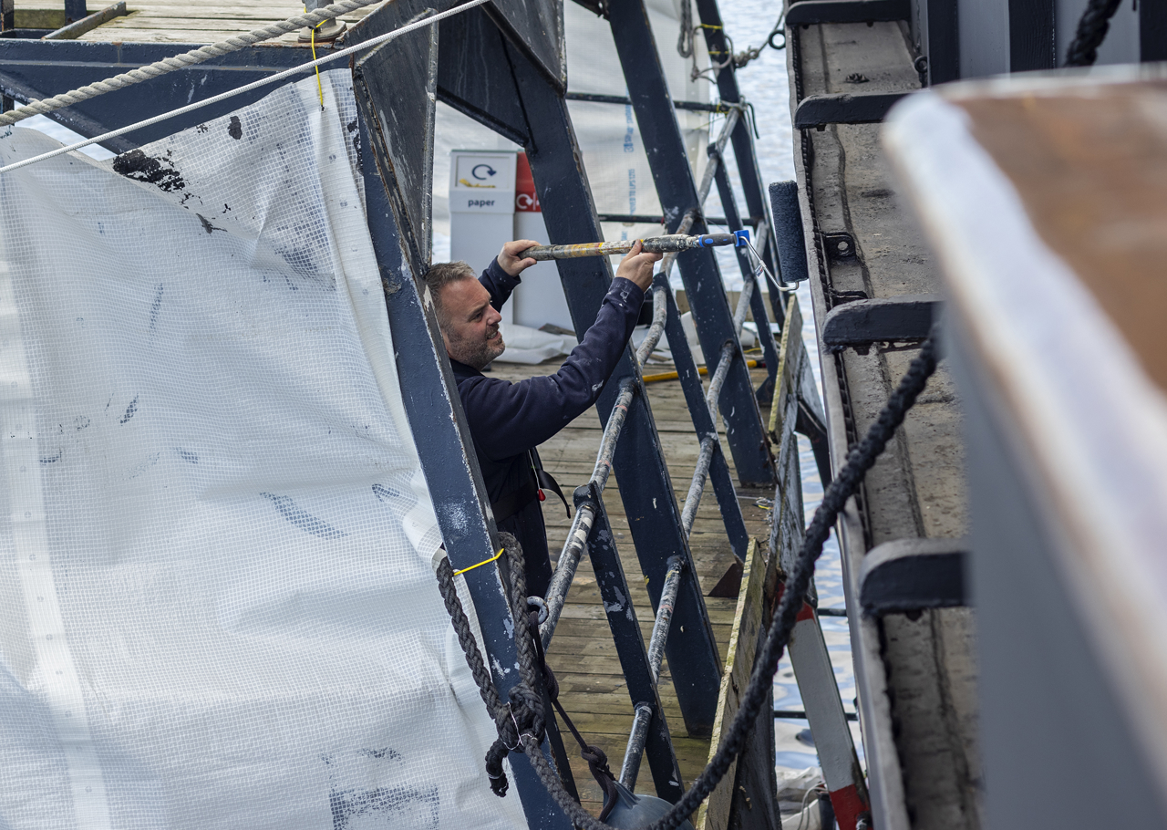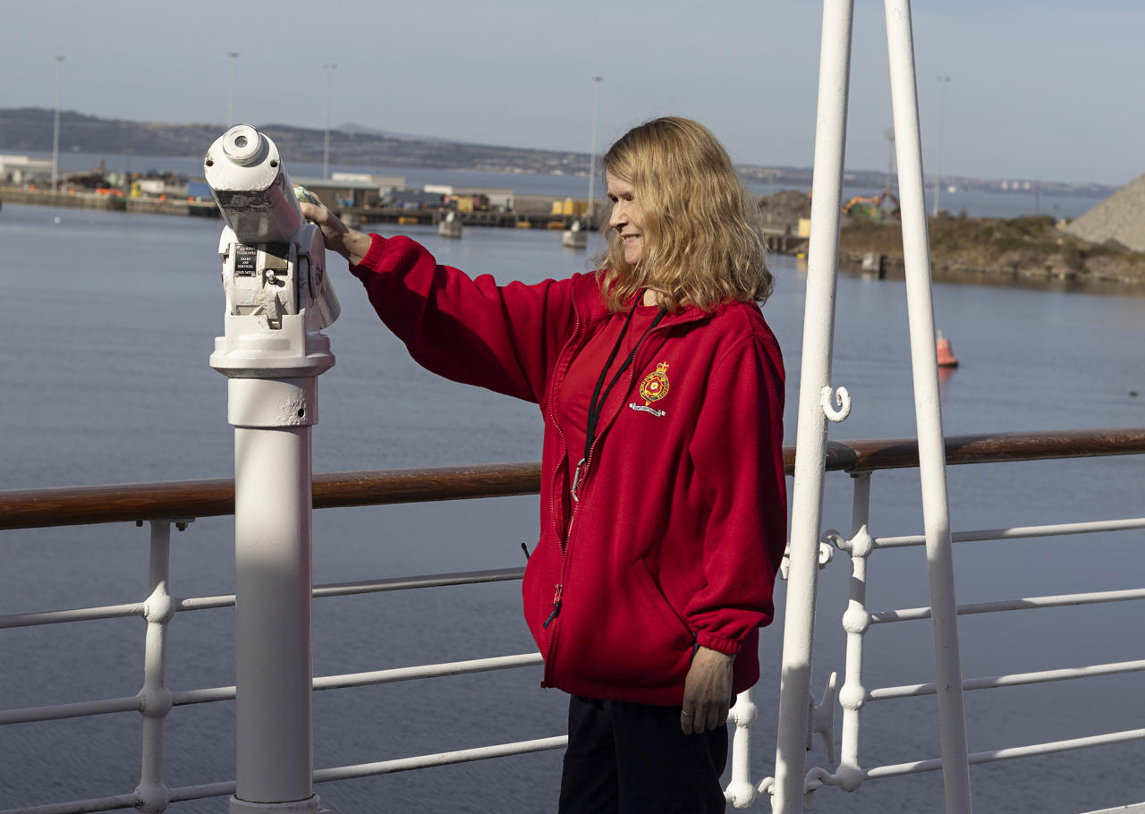 Housekeeper, Lynne, keeping the telescope on the Verandah Deck well polished so that visitors can take in the views across the Firth of Forth.