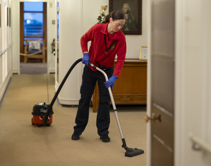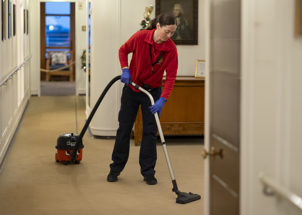 Housekeeper, Aiga, ensuring that the tour route is up to Royal standards, ready to welcome the day's visitors.