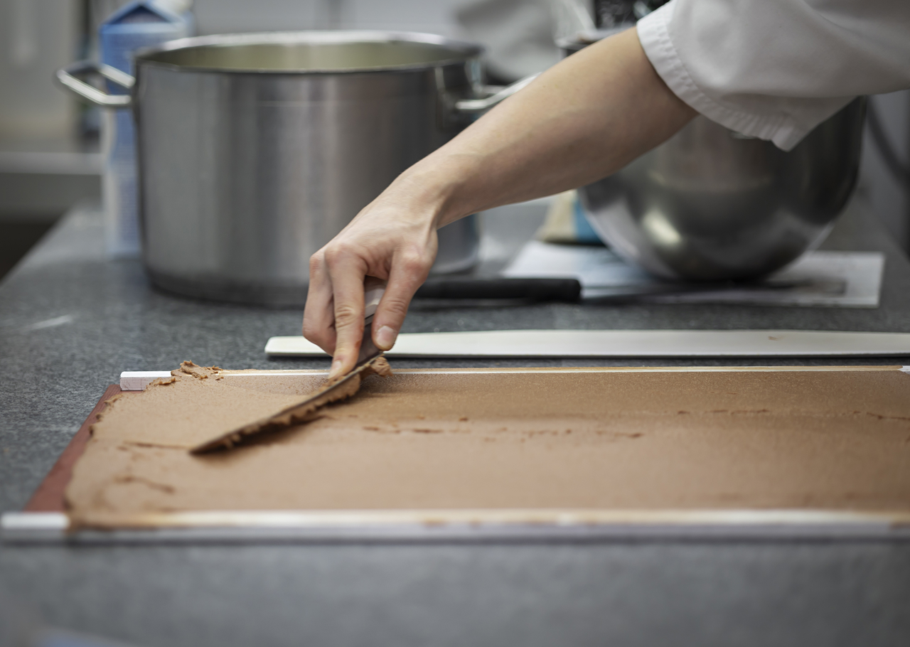 Chef de Partie, Amelia, making chocolate sponge cake, which will be used to make financiers to be served at an exclusive evening event.