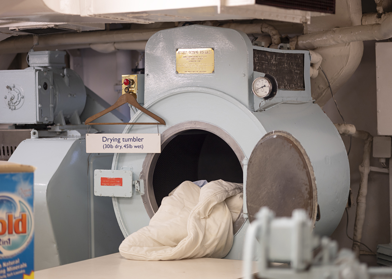With over 240 Officers and Yachtsmen and numerous daily uniform changes, the onboard Laundry was an extremely busy and hot place to work. Britannia's large Laundry was unique in the Royal Navy, partly due to her potential role as a hospital ship.