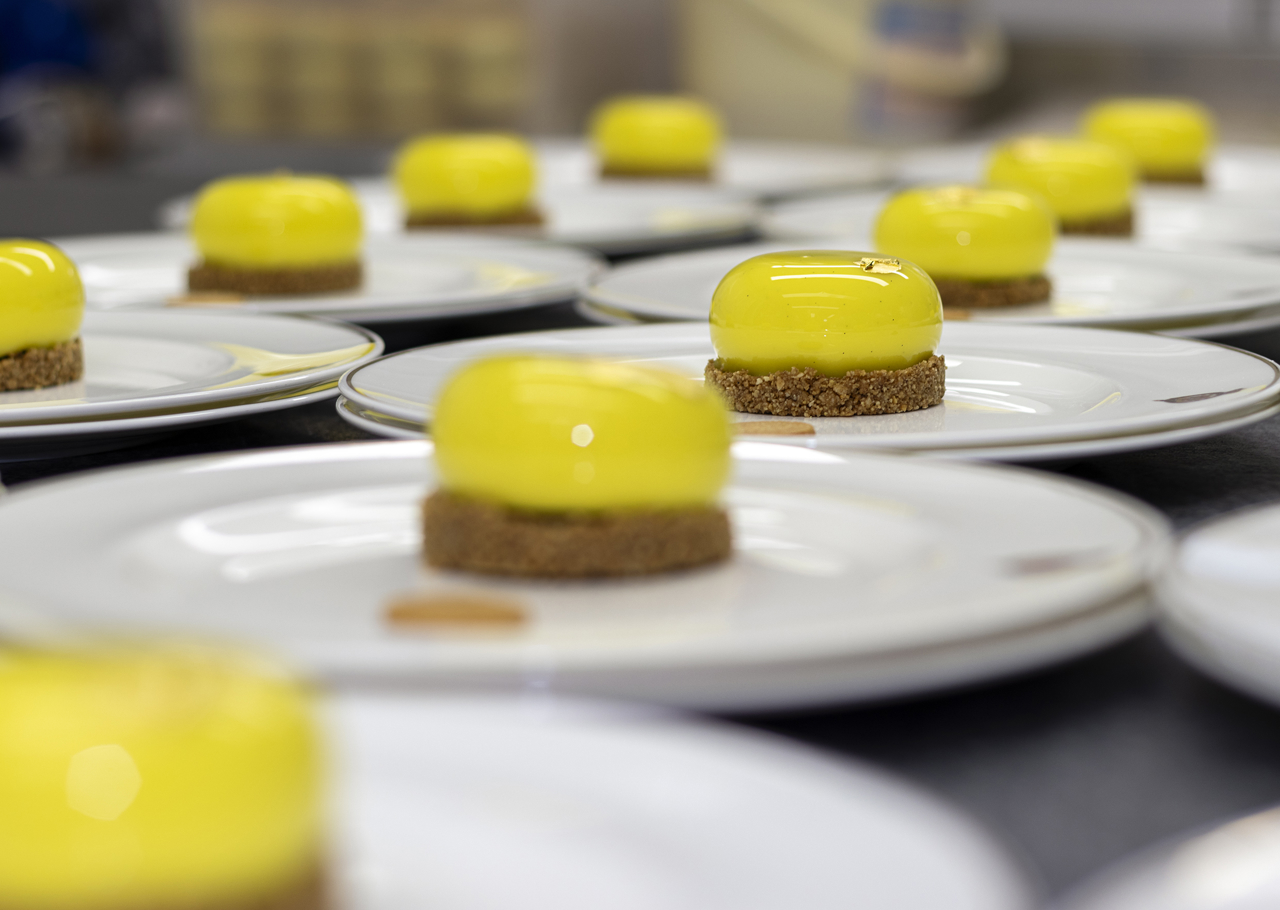 In the Galley, lemon cheesecakes are being prepared to be served to guests at an exclusive evening event.