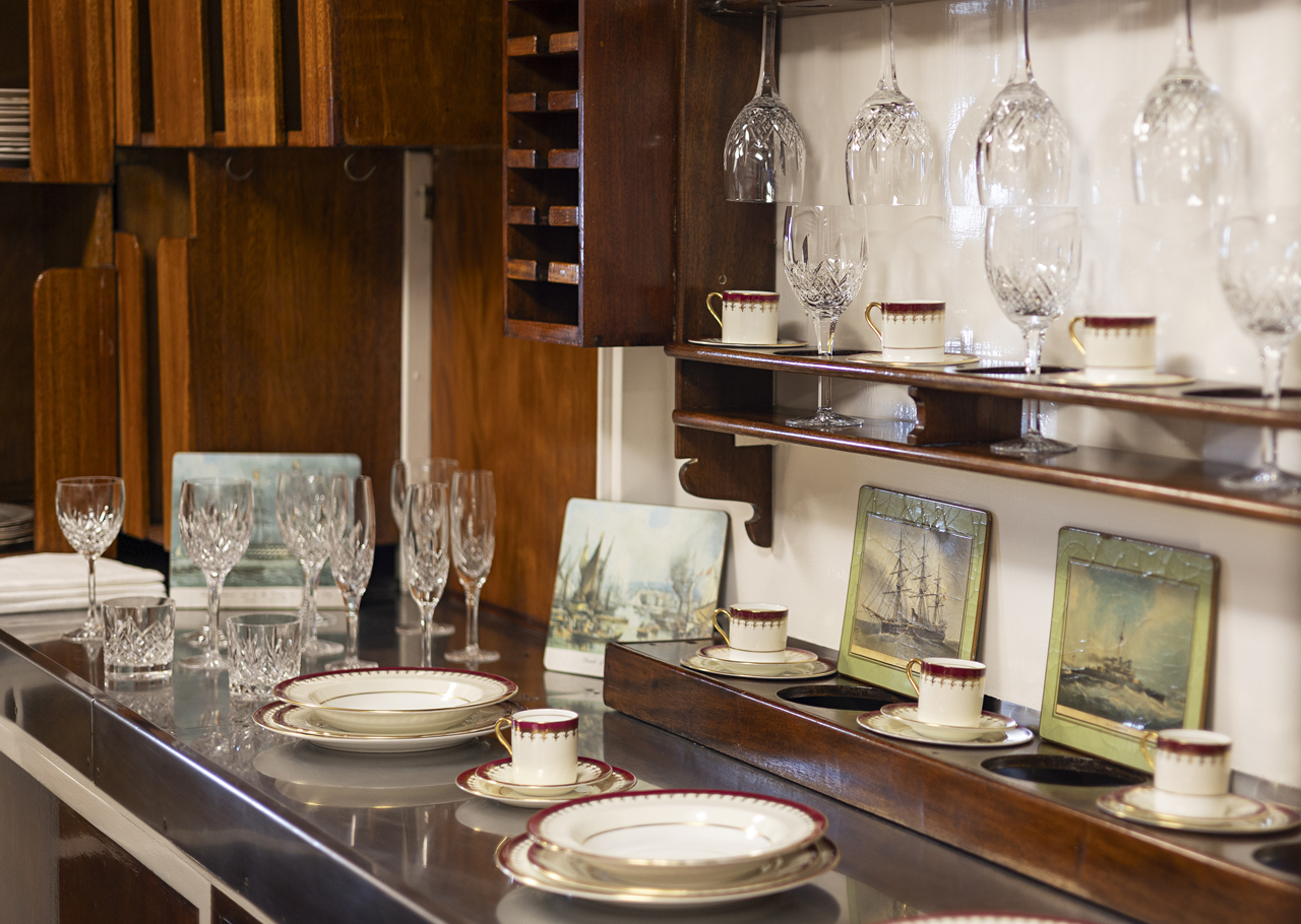 The Minton and Spode china for the Royal Dining Room was stored in the China and Glass Pantry. Each item has its own uniquely designed compartment, hook, or rack.