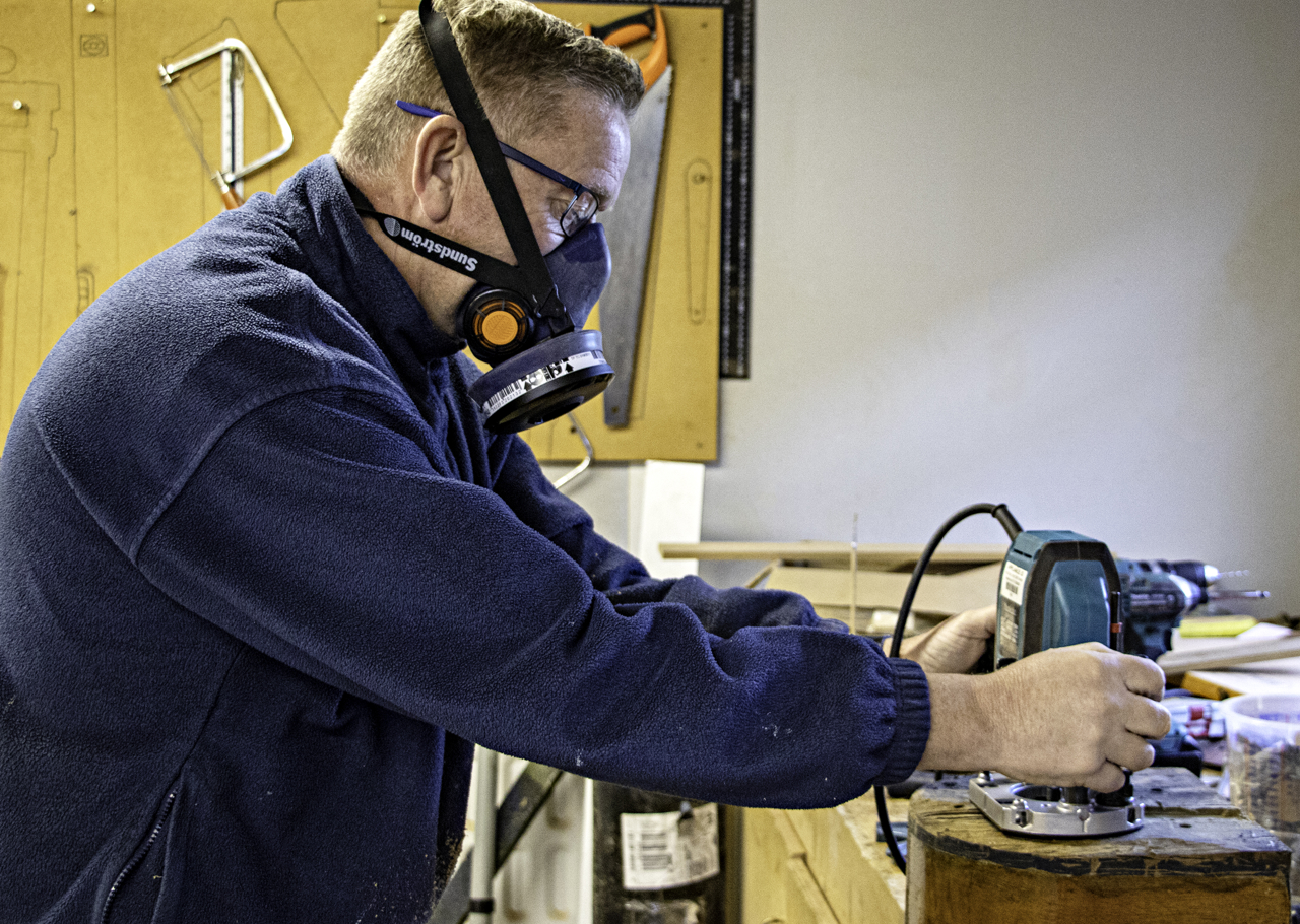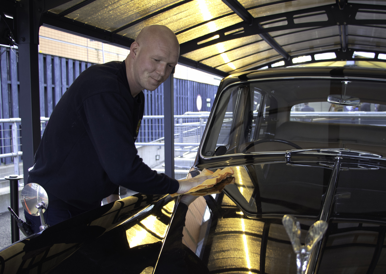 Donald, Facilities Officer, polishing the beautiful Rolls-Royce, so visitors can admire the Phantom V.