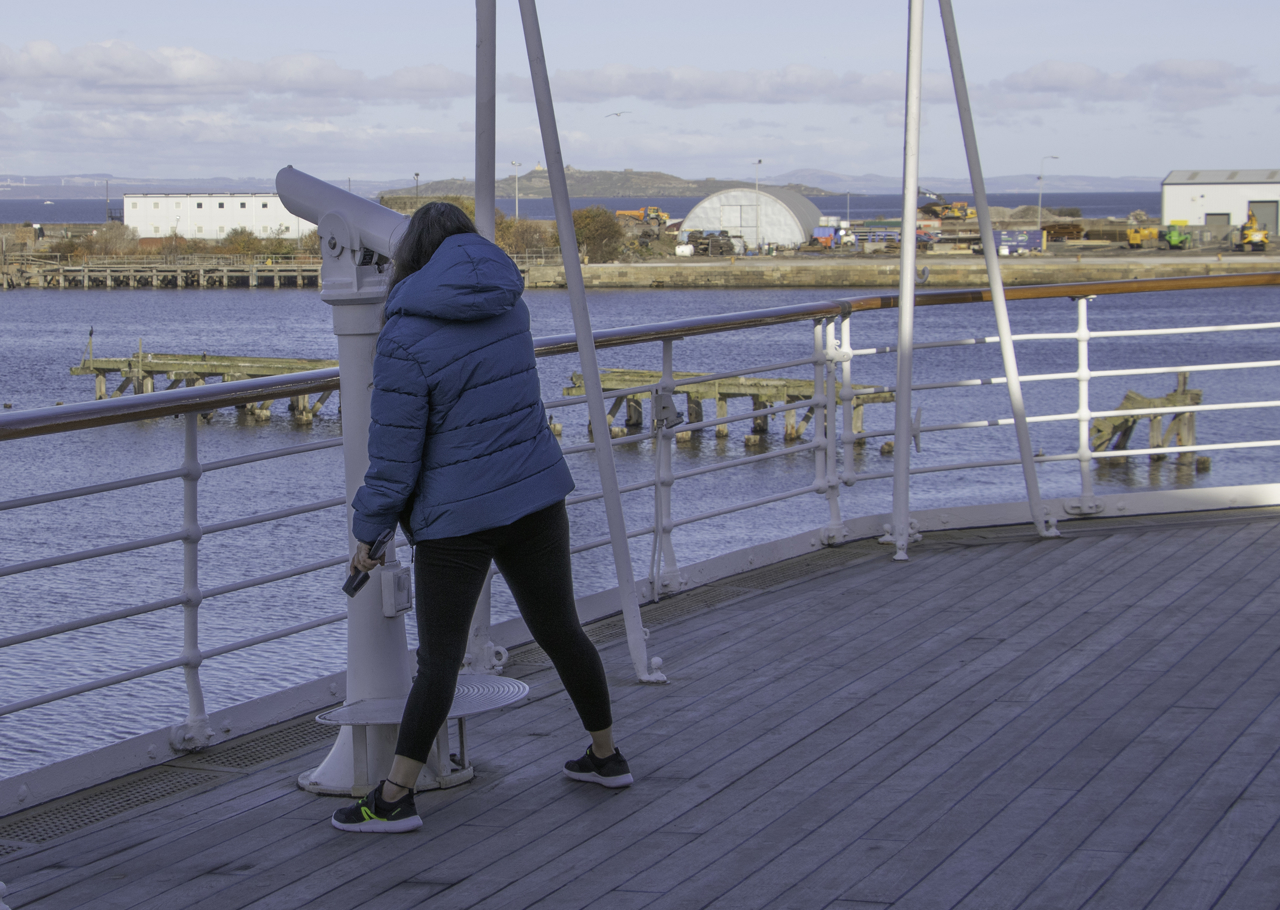 Britannia is berthed on the Firth of Forth and visitors can take in the panoramic views across the Port of Leith through the telescope on deck.