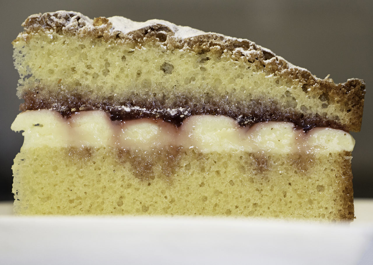 A slice of classic Victoria sandwich cake, named after Queen Victoria and widely thought to be her favourite teatime treat.
