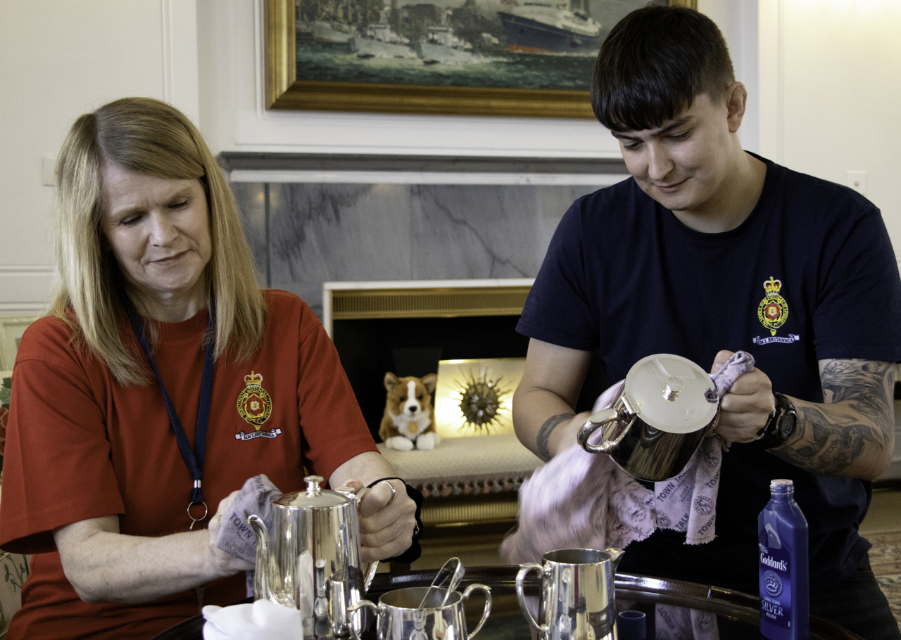 Lynne and James, Housekeeping Assistants, polishing silverware in the State Drawing Room.