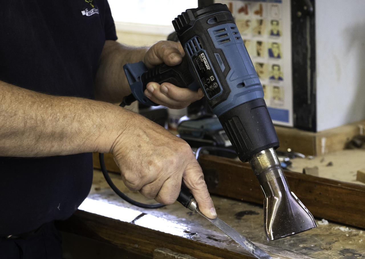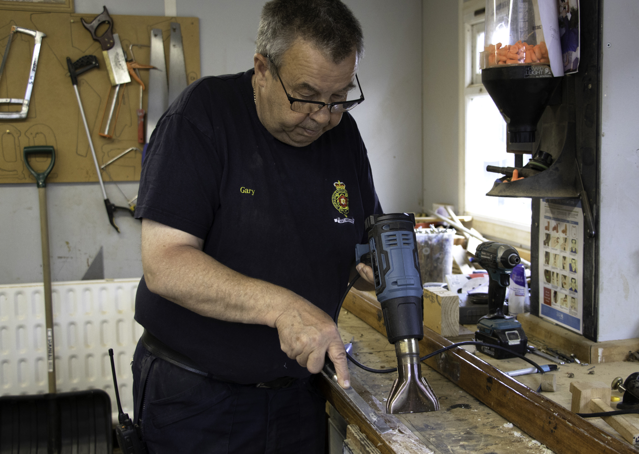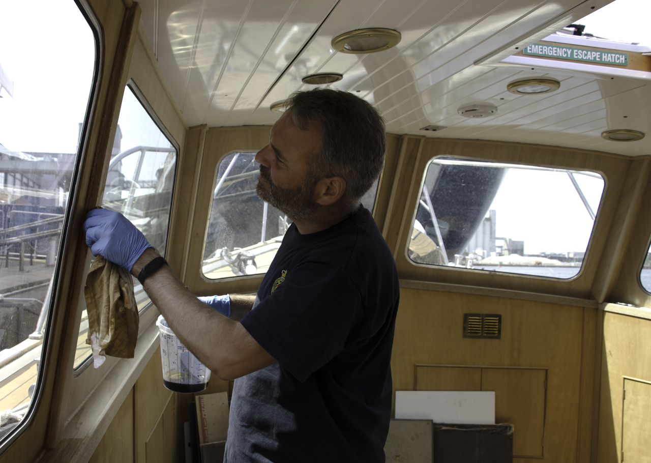 Gary removing varnish from a ladder handrail that goes from the Quarter Deck to the Verandah Deck.