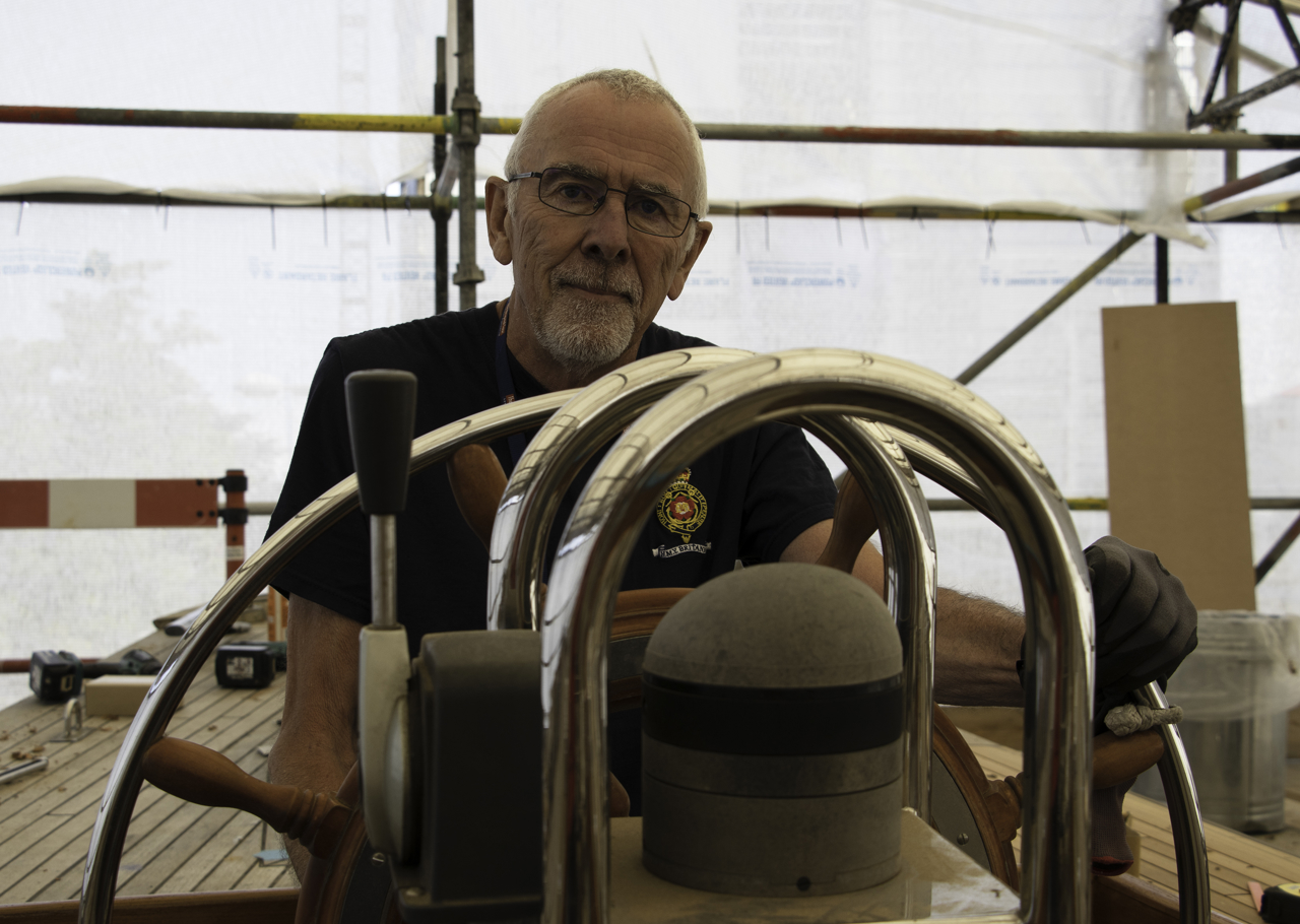 Colin adjusting the steering on Royal Racing Yacht Bloodhound.