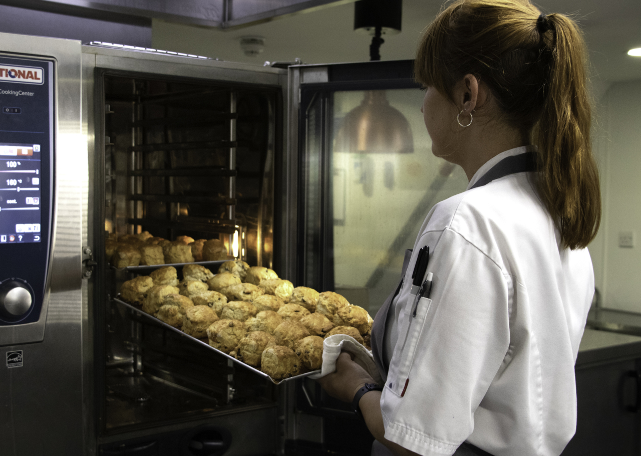 Arleta, Chef de Partie, taking scones out of the oven, ready to be served for Afternoon Tea.