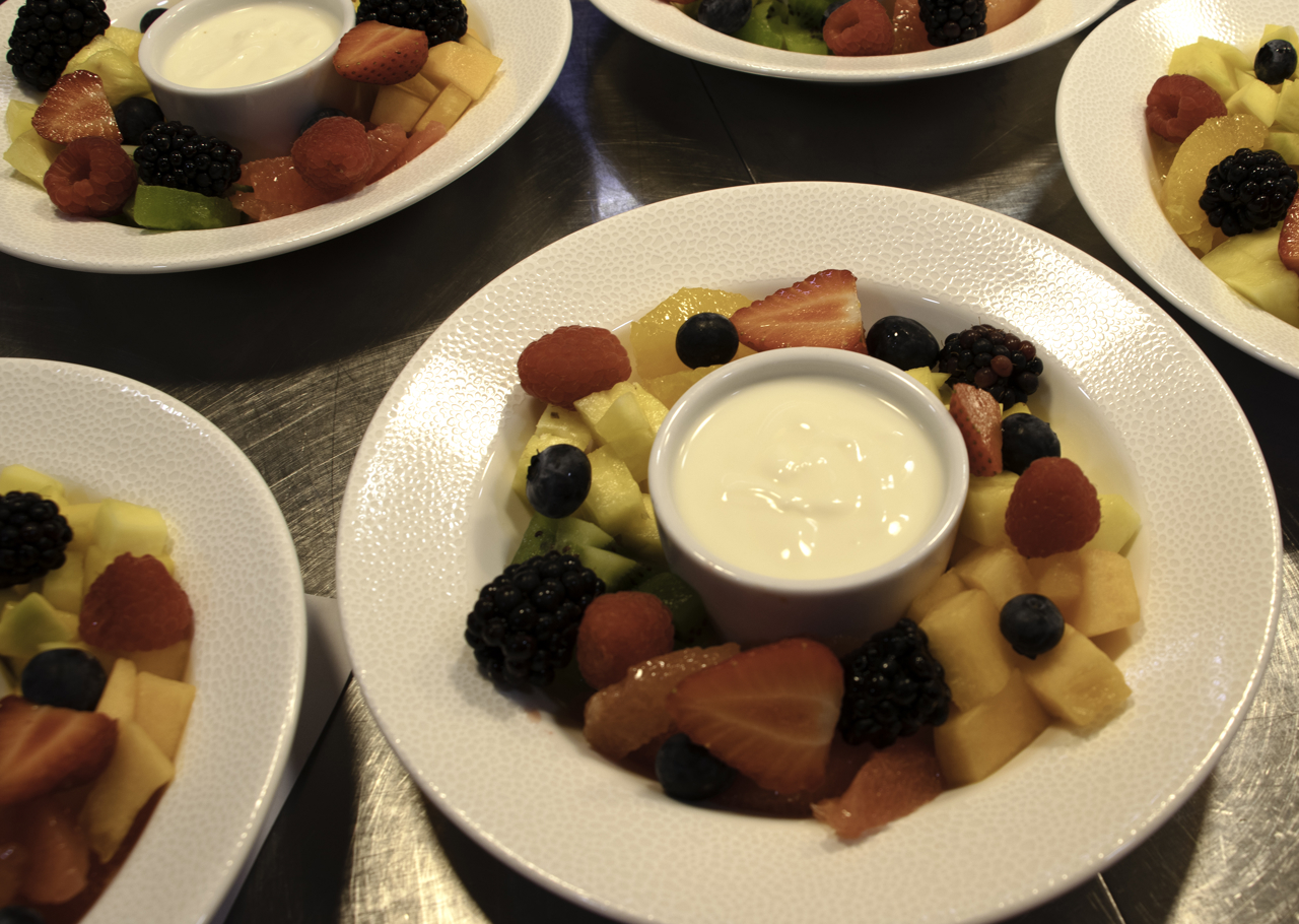 Fresh fruit salad and yoghurt is prepared for breakfast service aboard Fingal.