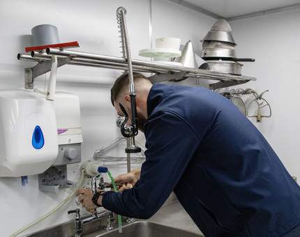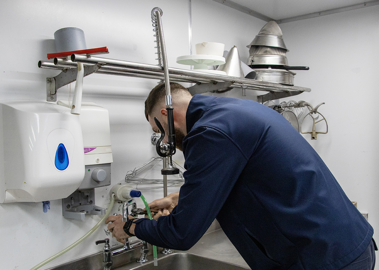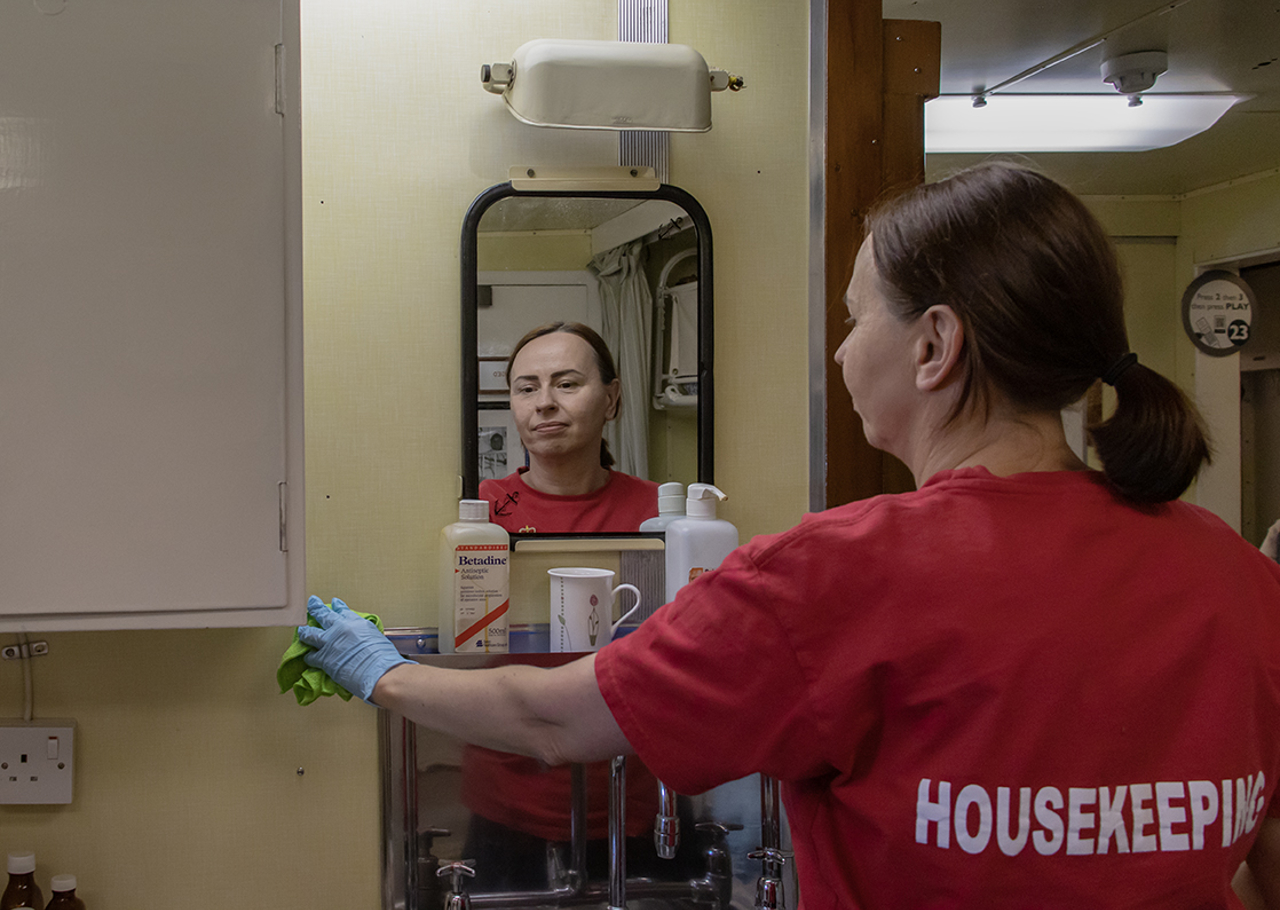 Housekeeper, Renata, carrying out a deep clean of Britannia's equipment in the Sick Bay. Visitors can also see the onboard Operating Theatre and Doctor's Consulting Room.