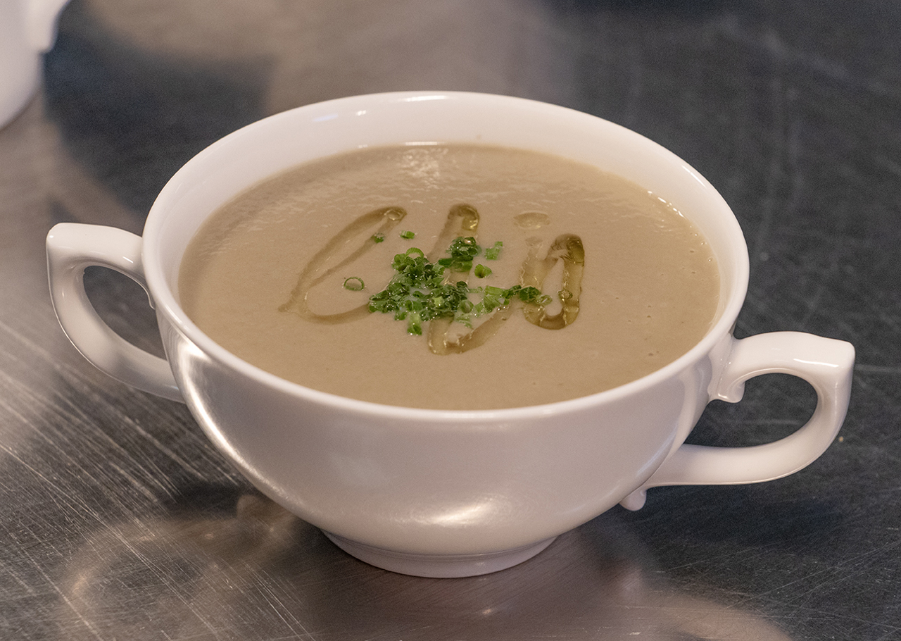 Delight in a spoonful of deliciousness with flat field mushroom, truffle, and chive soup, awaiting visitors at the Royal Yacht Britannia.