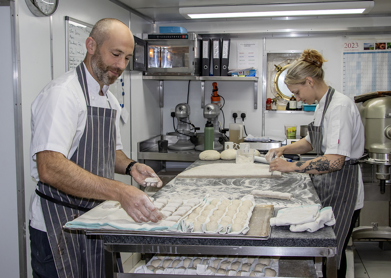 Stephen, Executive Pastry Chef and Amelia, Chef de Partie, crafting delicious bread rolls in the Galley.