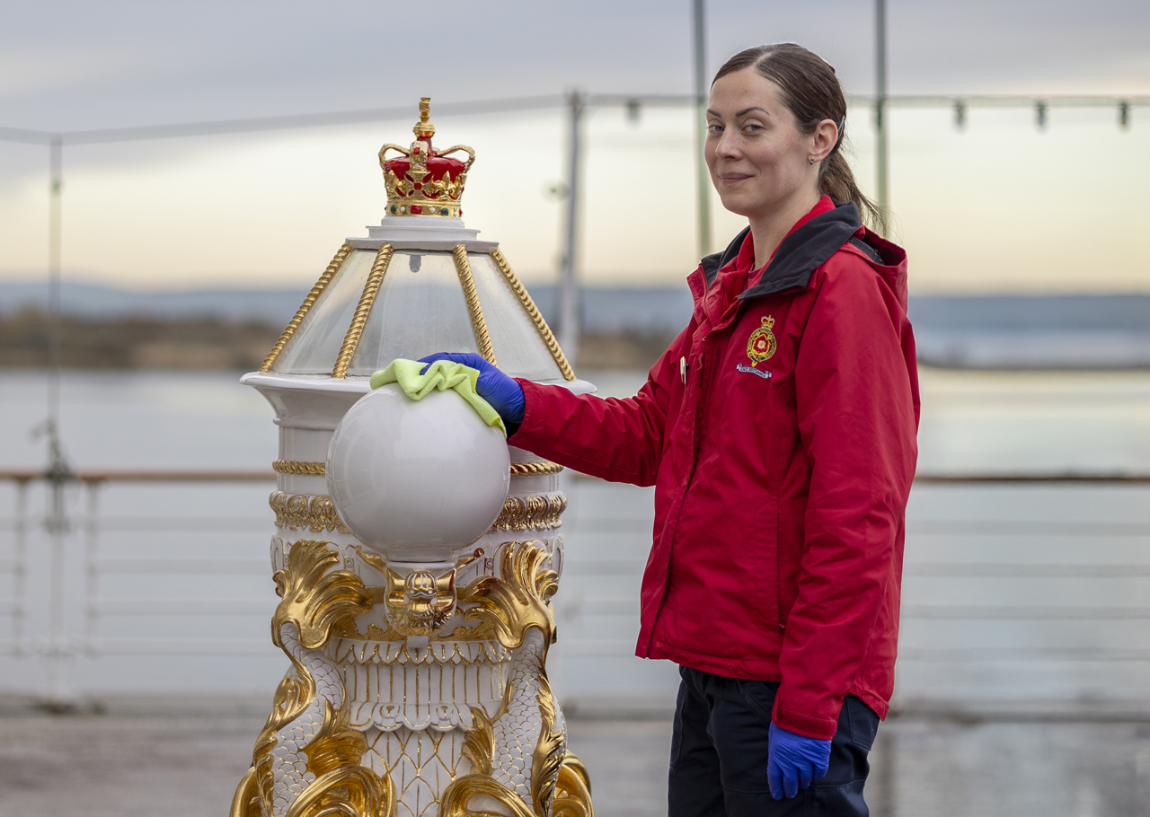 Aiga, Housekeeper, cleaning the replica Binnacle on the Verandah Deck.