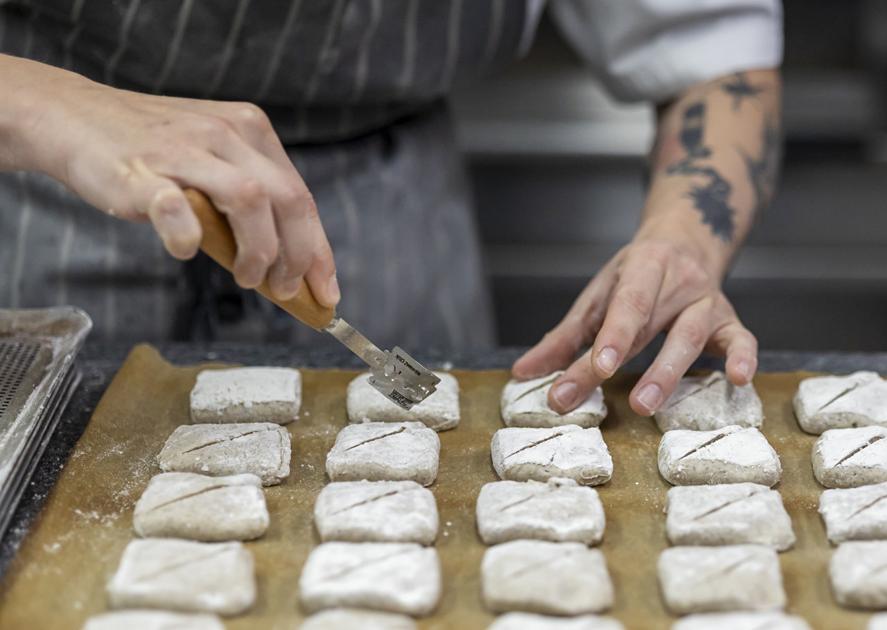 Amelia, Chef de Partie, scoring the dough in the Pastry Galley.