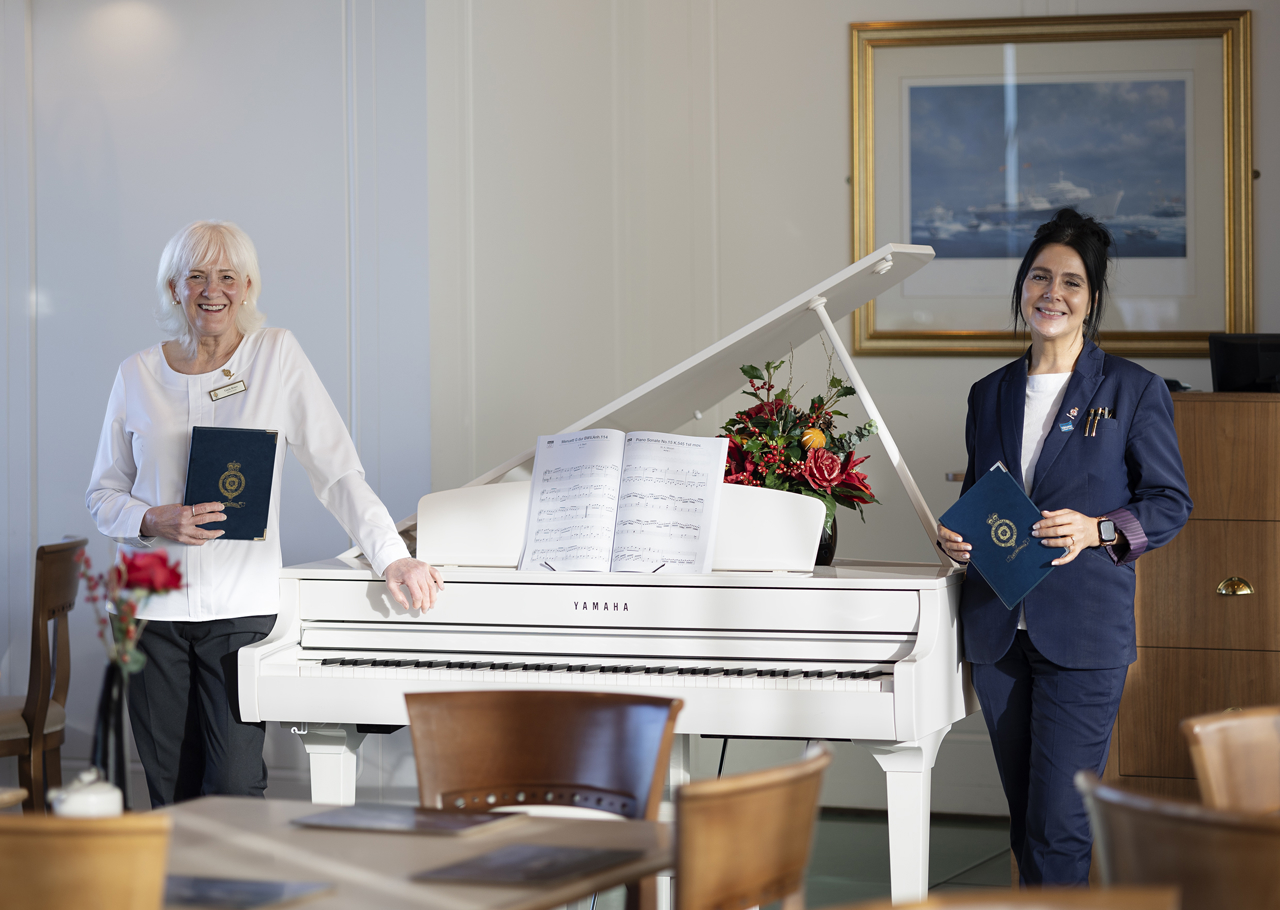 Gayle, Senior Host, and Wendy, Food & Beverage Supervisor, are ready to serve in the Royal Deck Tearoom.