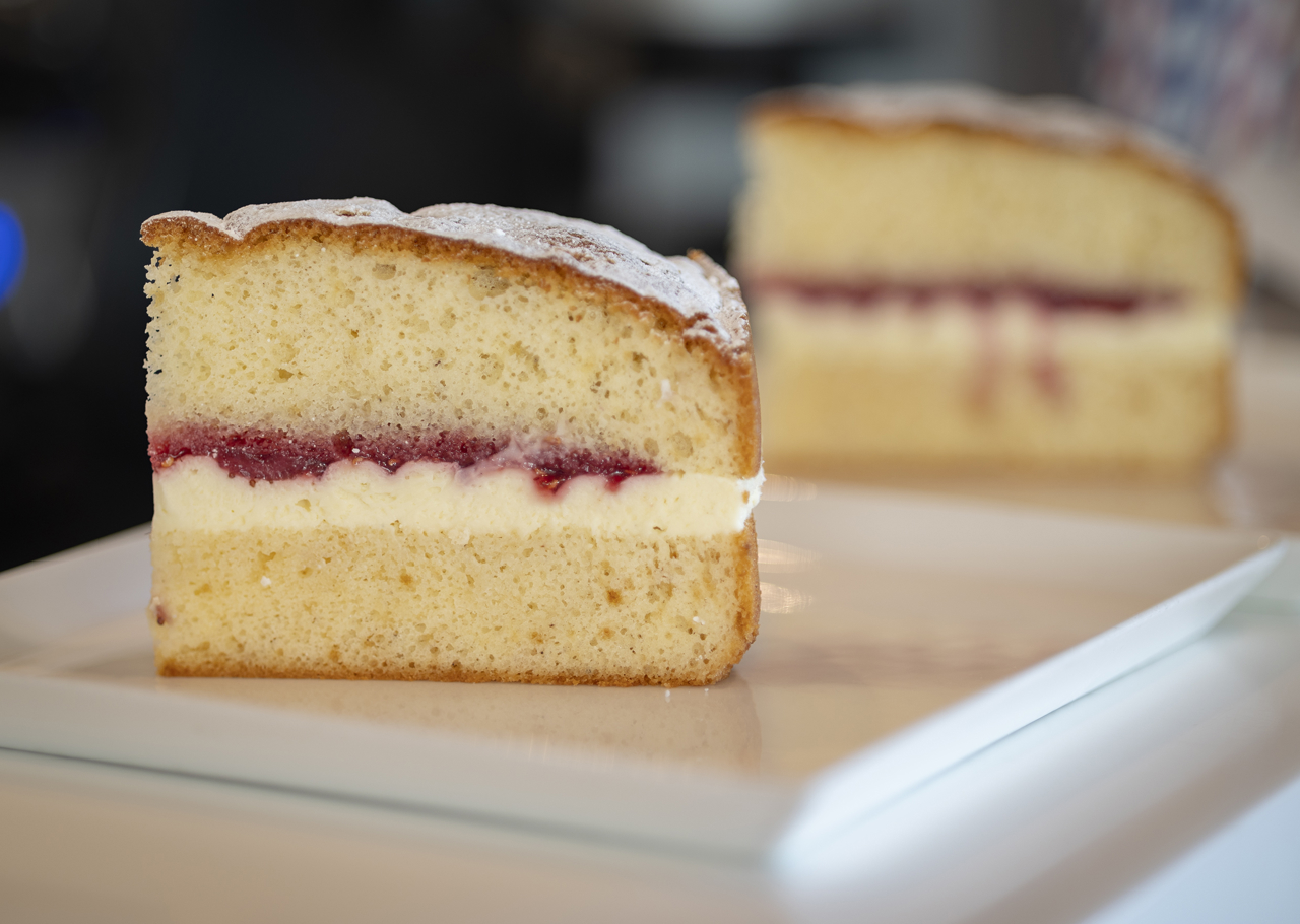 A decadent slice of Victoria sponge cake awaits in the Tearoom.