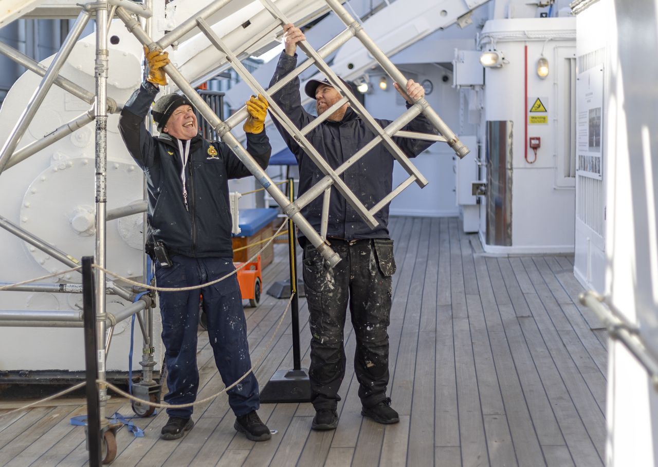 Nigel and Stevie putting up scaffolding on the Port Shelter Deck for painting work.