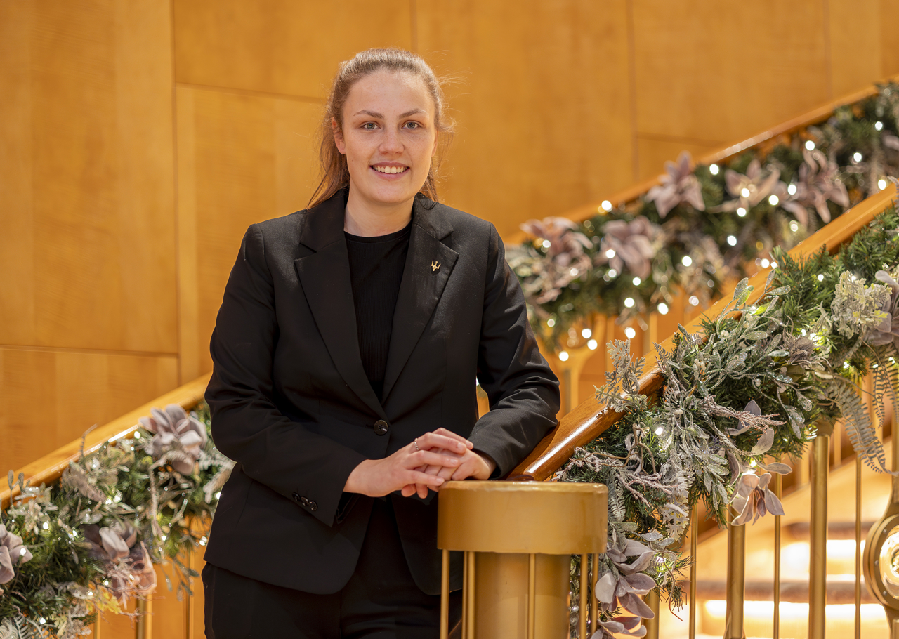 Becky, Hospitality Supervisor, pauses for a photograph on one of two sweeping staircases, as she prepares the Ballroom for an event.
