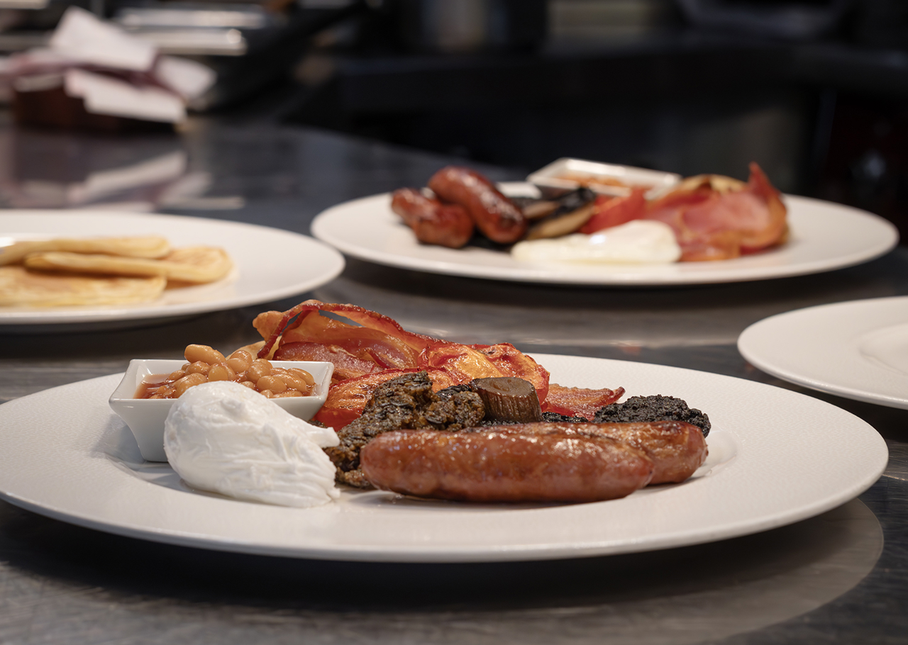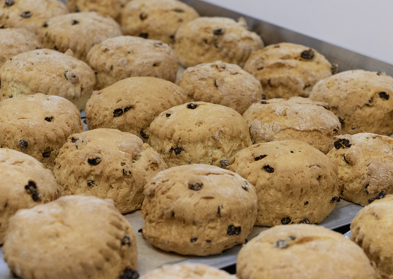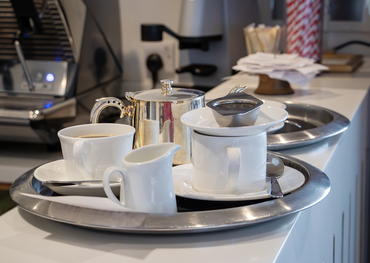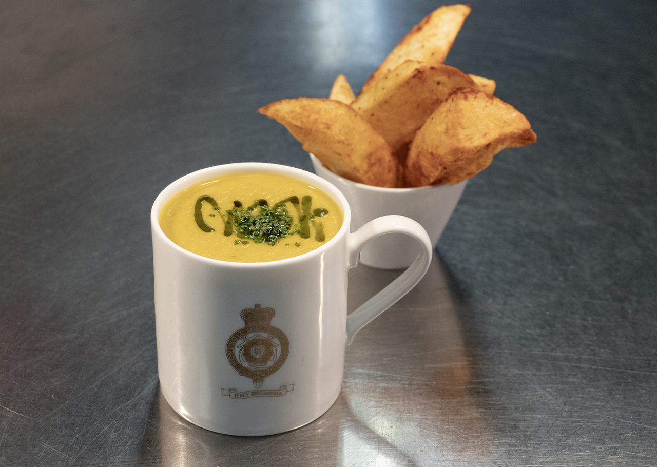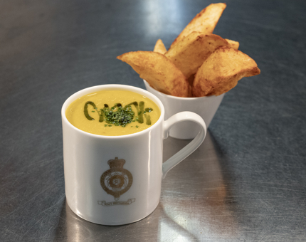 A delicious mug of warming soup and moreish paprika-topped potato wedges, ready to be enjoyed in the Royal Deck Tearoom.