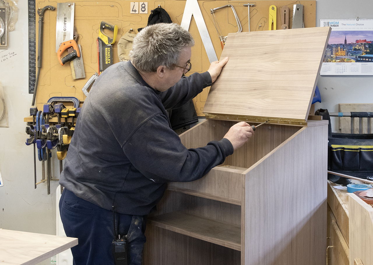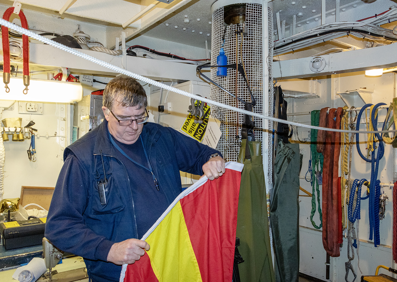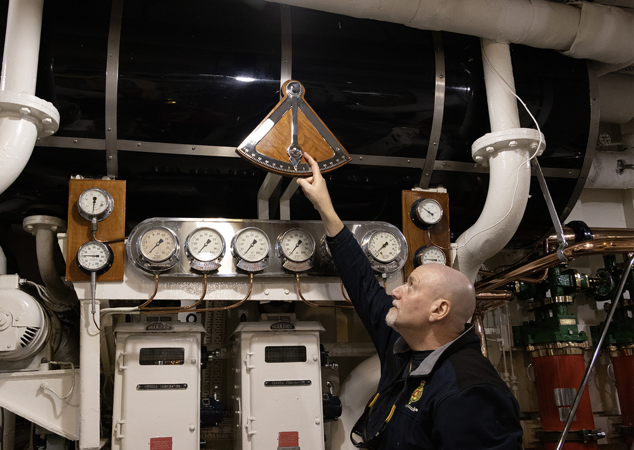 Stuart checking the clinometer, an instrument which measures angles of slope, how much a ship lists.
