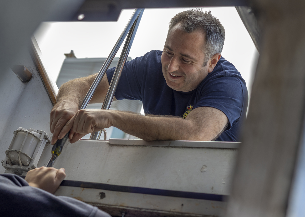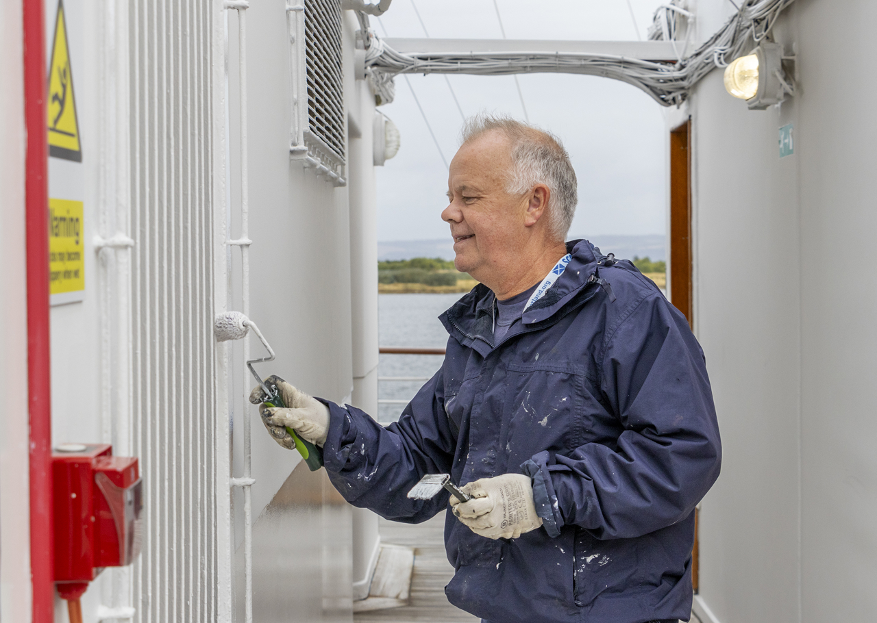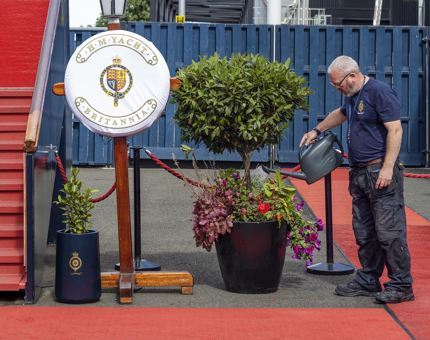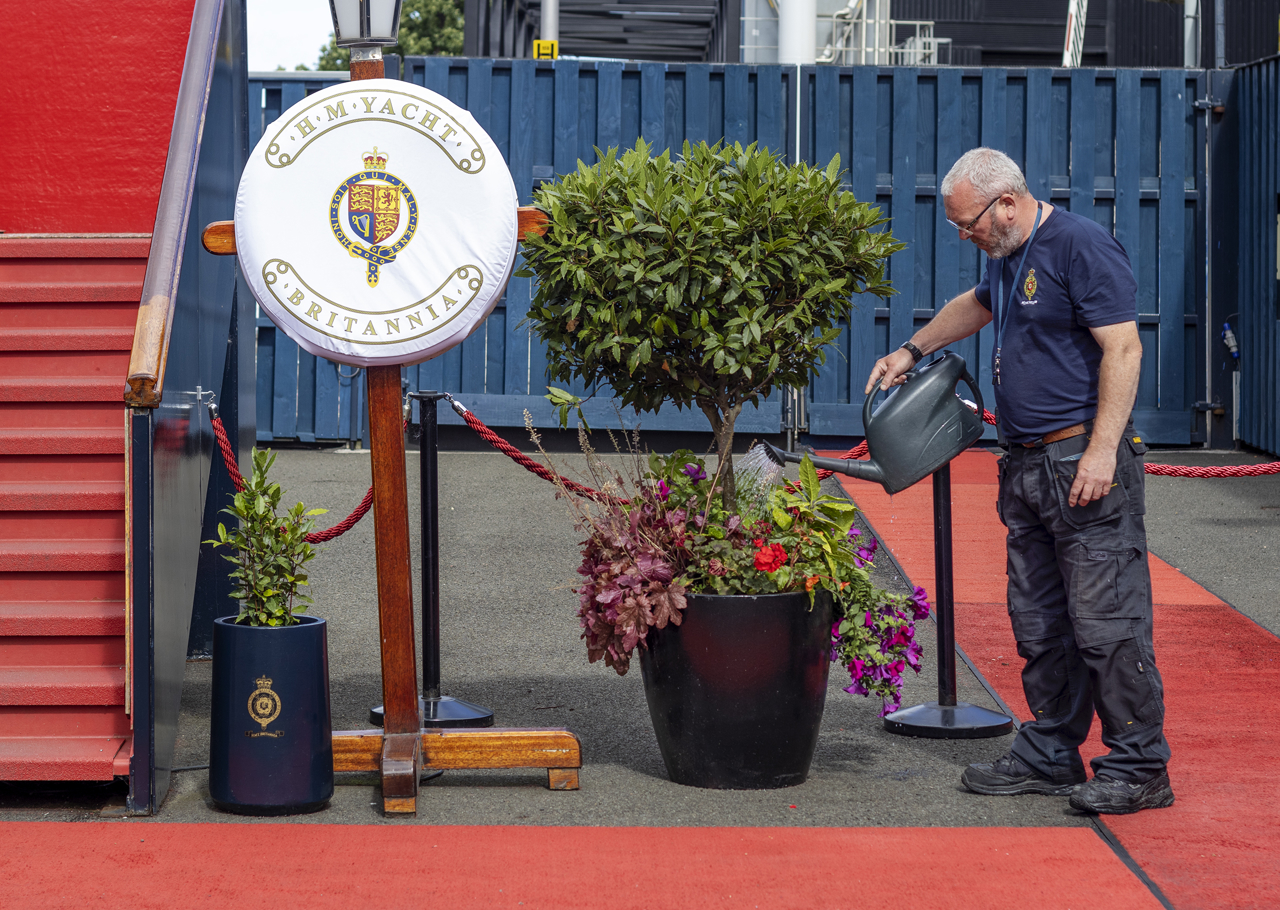 Billy, Facilities Officer, watering the plants on the quayside at The Royal Yacht Britannia, ensuring a bright welcome.