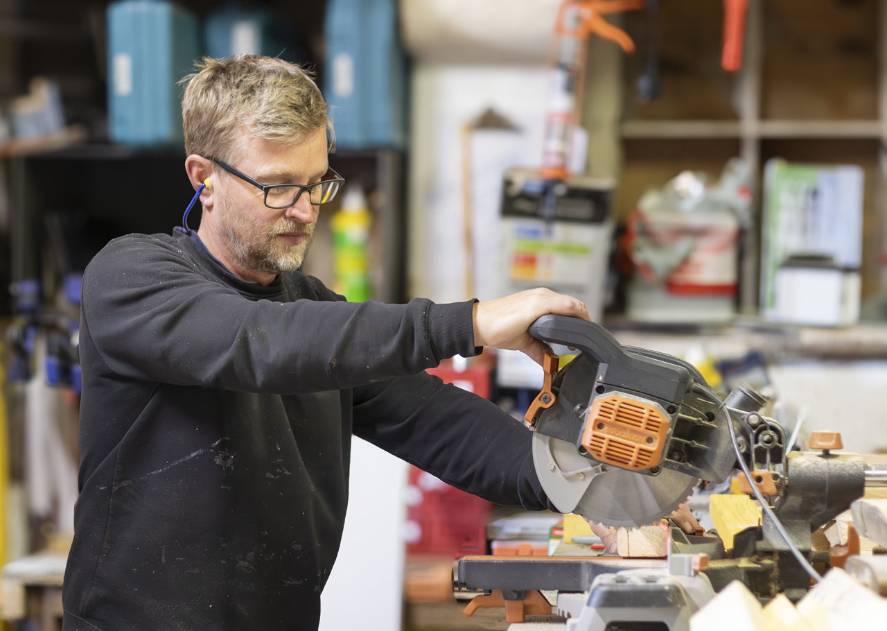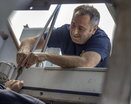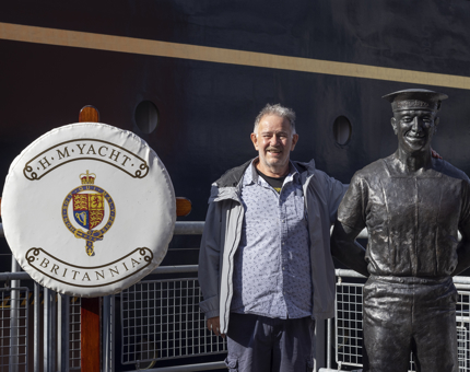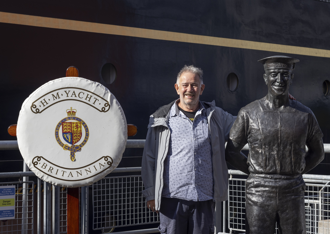 A visitor standing next to the statue of the longest serving Royal Yachtsman, Ellis 'Norrie' Norrell MVO RVM.