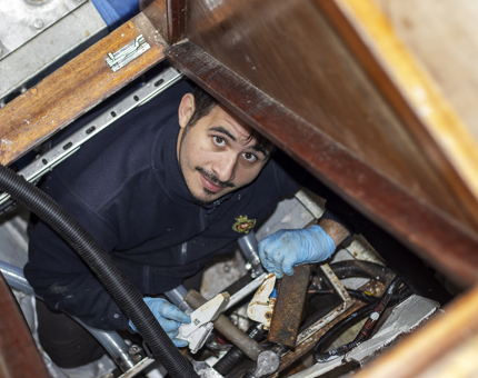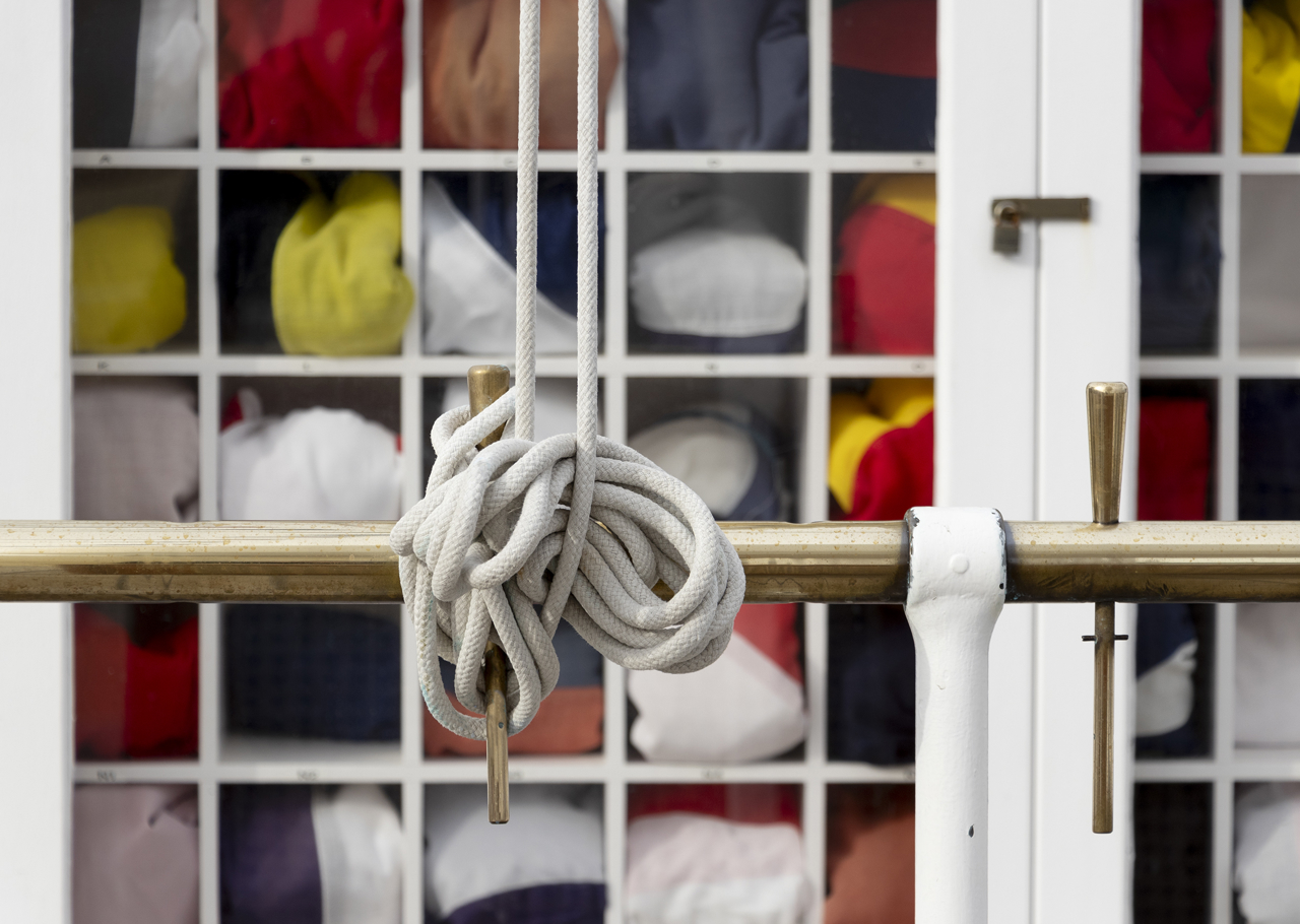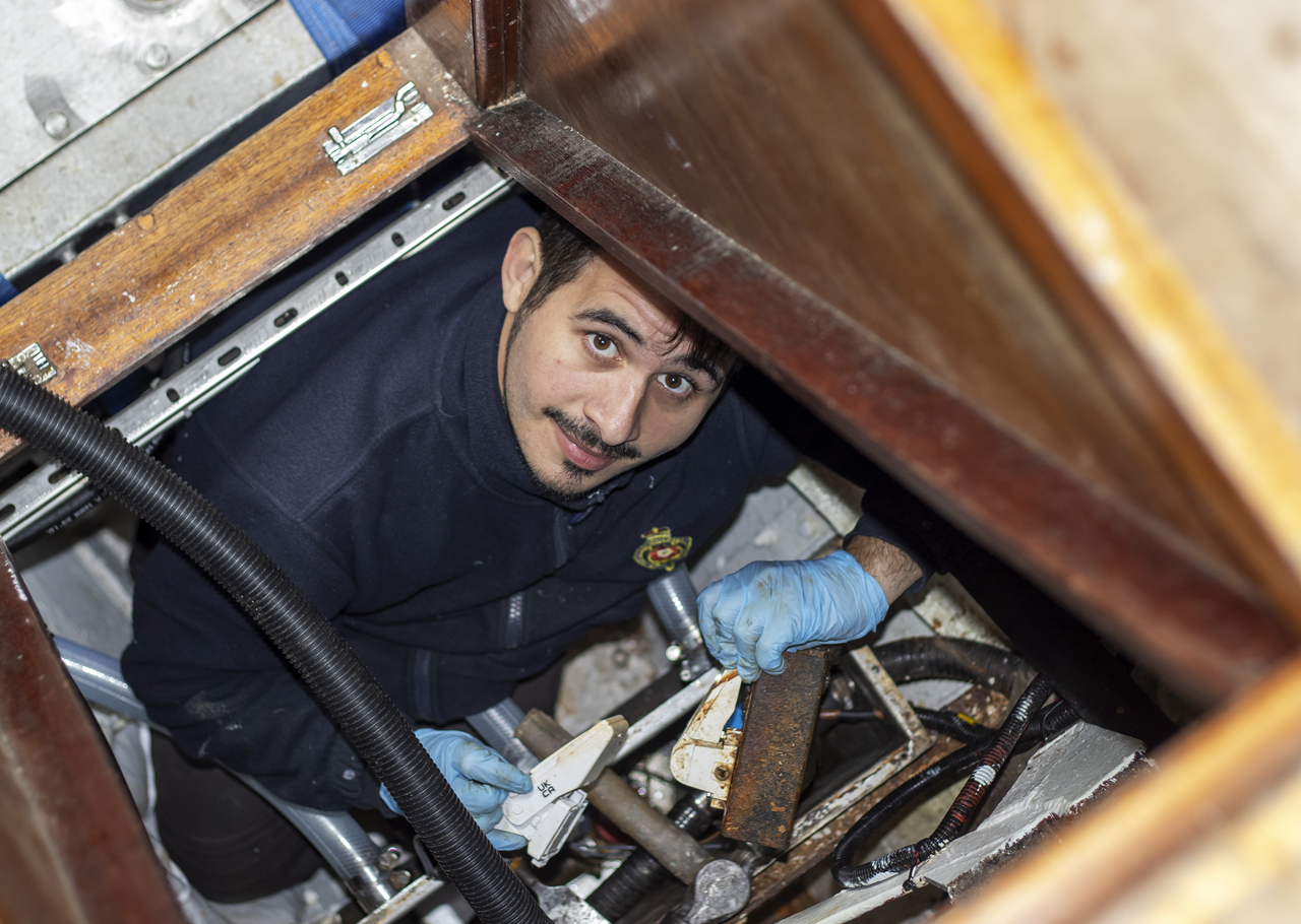 Housekeeper, Iryna, taking care of the Admiral's Day Cabin, which was used by the Admiral for working, entertaining and dining.