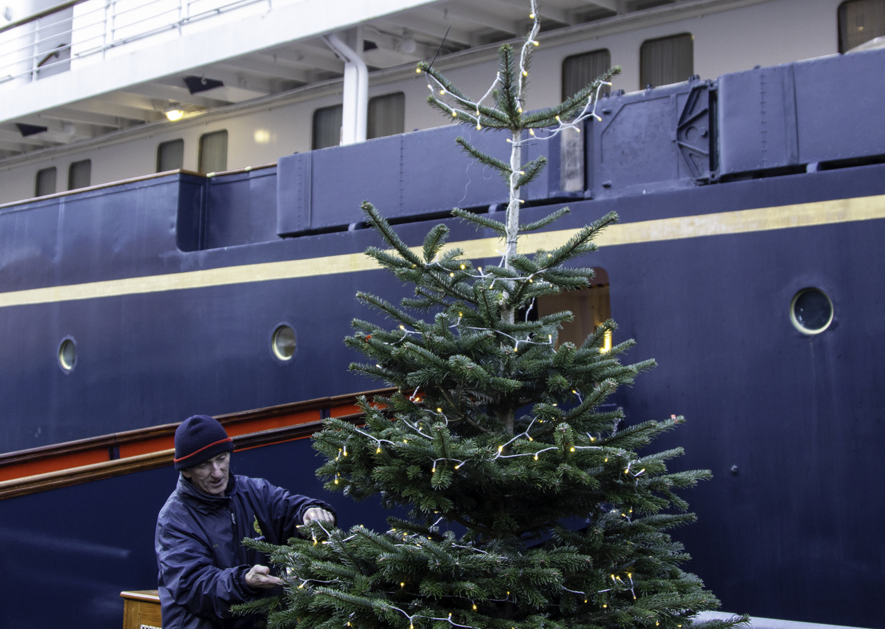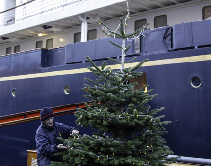Renata, Housekeeper, polishing the Grand Staircase bannisters, magnificently decorated for Christmas week on Britannia.