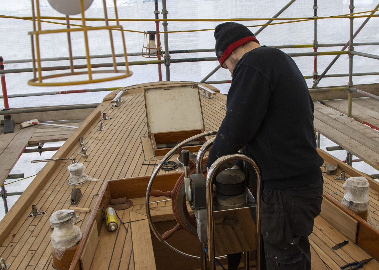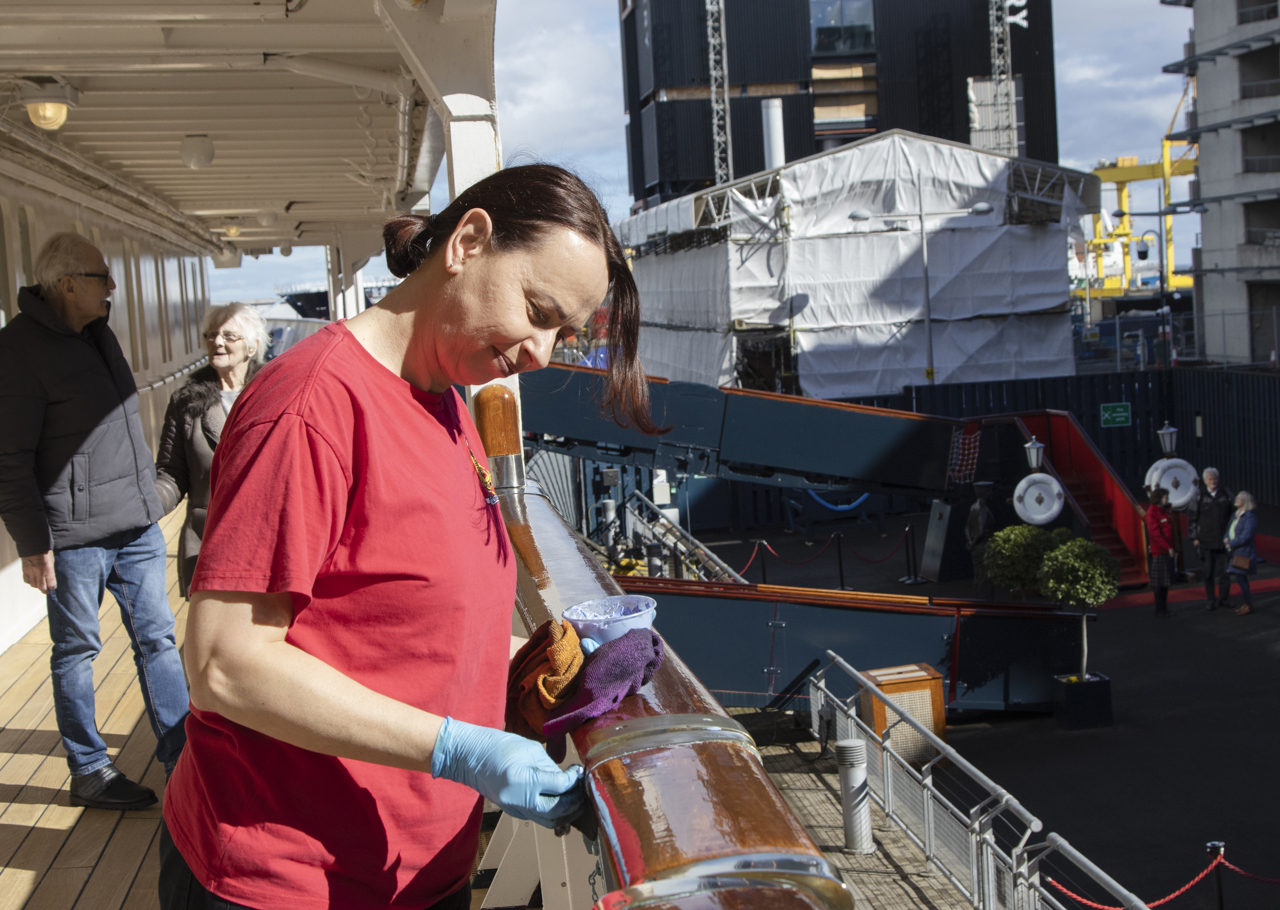 Renata, Housekeeper, polishing handrails in the sunshine outside on the Shelter Deck. Work on Bloodhound continues in the background.