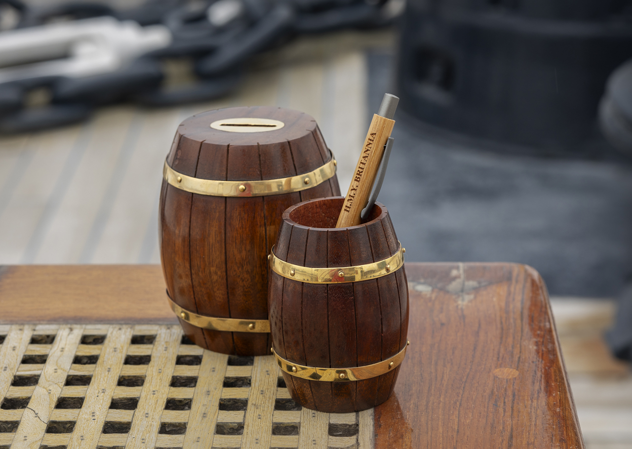 This rum tub money box and pencil pot are available to purchase from our Shop. Up until 1970, the Royal Yachtsmen were issued a daily ration of rum.