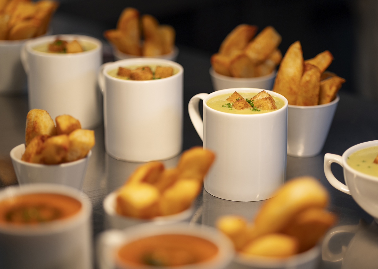 Prepared in the onboard Galley, visitors to the Royal Deck Tearoom indulge in a sumptuous selection of soups, sandwiches, cakes, and scones.
